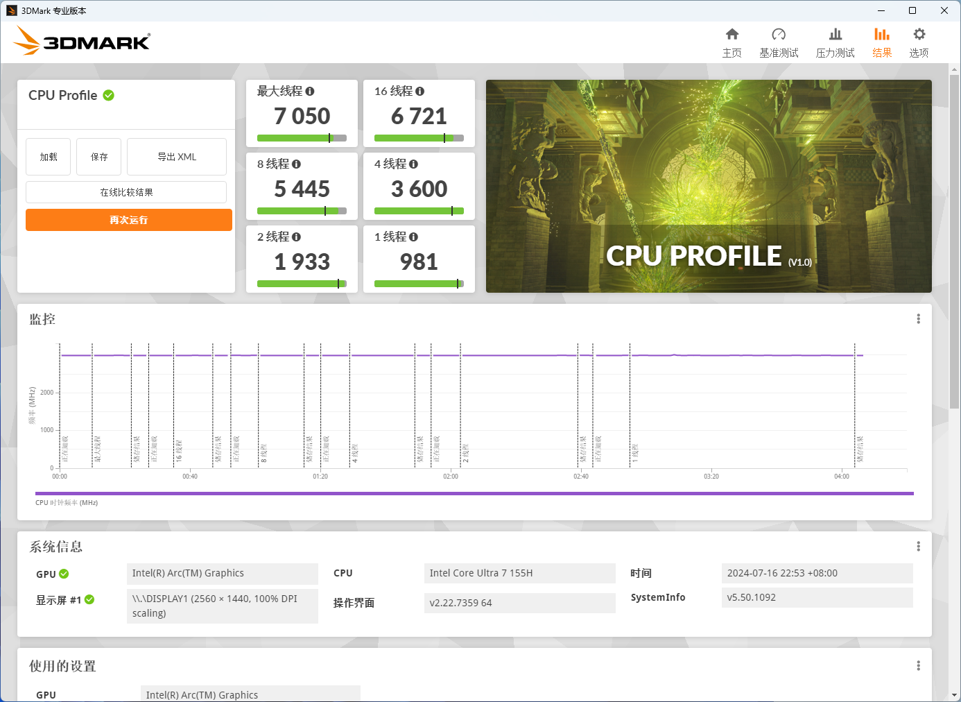 在 CPU Profile 的测试数据中,可以看到最大线程得分为7050,16 线程得分为6721,8 线程得分为5445,4 线程得分为3600,2 线程得分为1933,单线程得分为981。该 CPU 在处理多线程任务时具有非常强大的性能,例如视频编码和 3D 渲染等工作,而在单线程任务上也有令人满意的表现。因此,能够适应多种计算场景,无论是日常办公应用还是更复杂的专业工作负载。