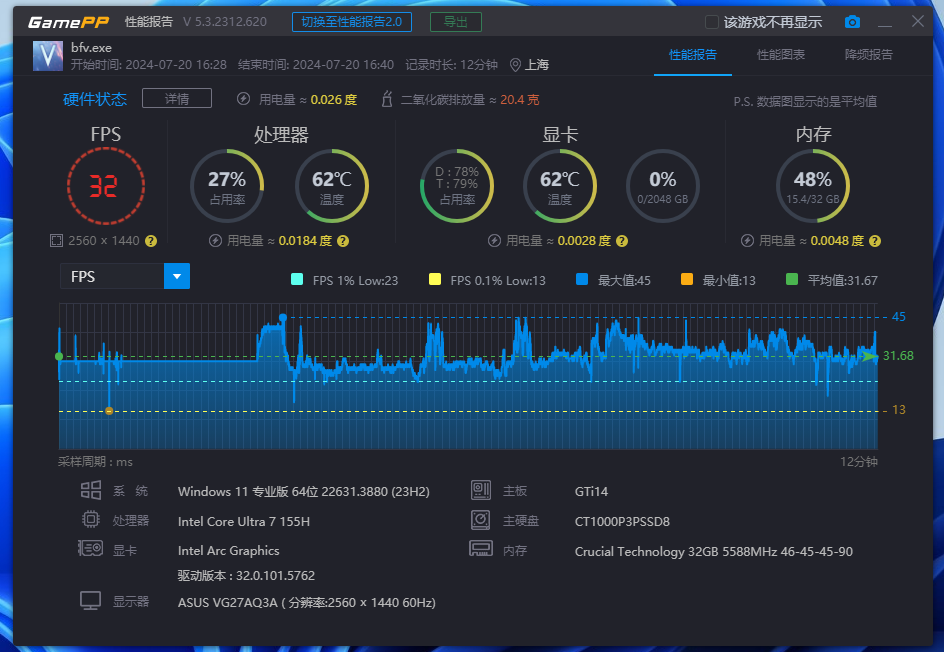 从检测数据上看:平均帧数为 32,内存占用 48%,CPU 占用 27%,显卡占用 78% 以上。显卡负载较高,显示出其压力较大,如果追求更流畅的体验可以降低到1080P。