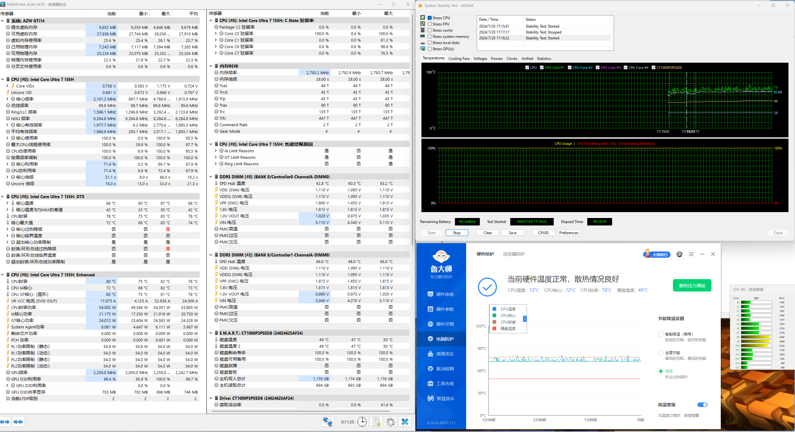 英特尔 Ultra7 155H 处理器采用 16 核心 22 线程设计,三级缓存为 24MB。核心架构为 6 性能核、8 能效核心和 2 低功耗核心,最低保证功率仅为 20W,非常节能;最大睿频功率可达 115W,睿频最高达 4.8GHz。CPU+GPU+NPU 的最大算力达到 32TOPS。