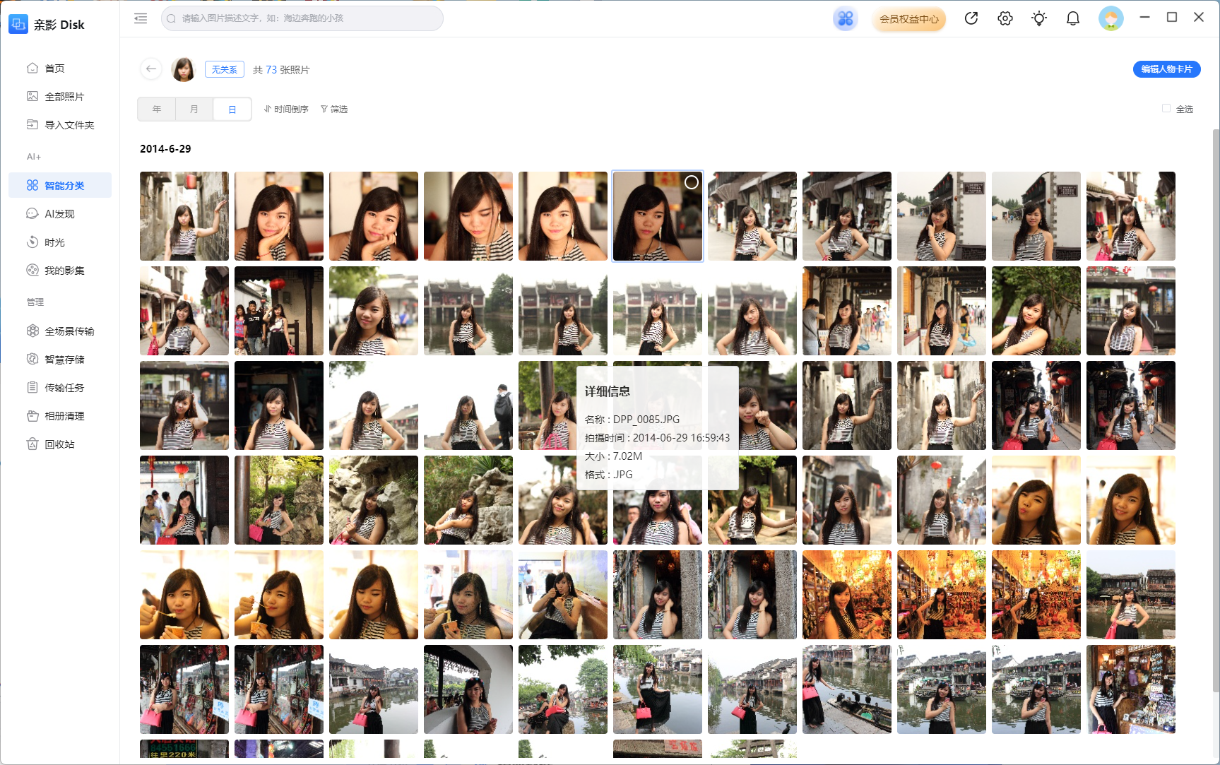 在管理照片时,寻找特定照片往往是个大工程。亲影通过支持人物、地点、时间、事物和场景等多维度搜索,轻松解决用户找照片的烦恼。这个 “搜索” 功能非常强大,用户只需输入关键字,就能在成千上万张照片中准确找到需要的那一张。因此,对于亲影来说,“大海捞针” 也不再是难事。
