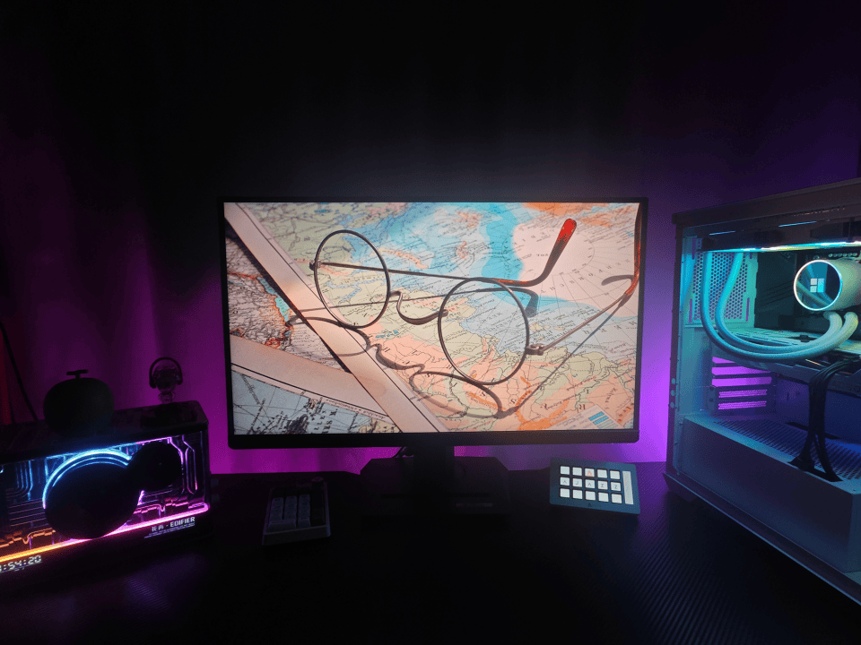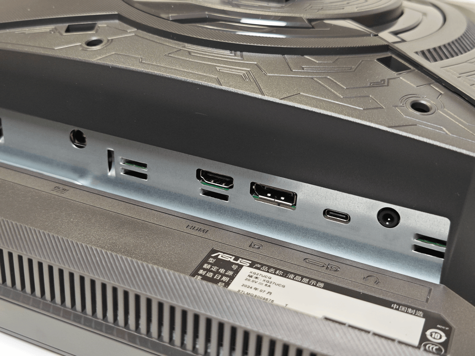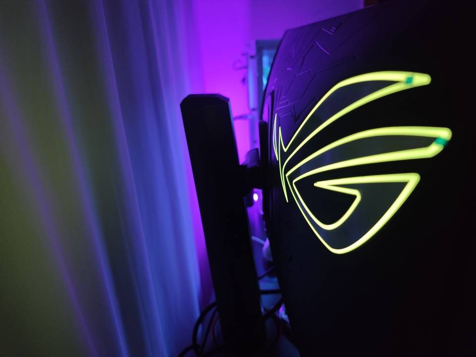 显示器背面左侧为按键操控区域,配备了一个全向摇杆和四个物理按键,通过它们可以很方便的进行显示器设置。另外背部右上还配备了RGB灯带,支持AURA SYNC 神光同步灯效,夜晚玩游戏时背面不再漆黑一片,信仰之眼发出色彩斑斓的灯光,直接将电竞氛围拉满。