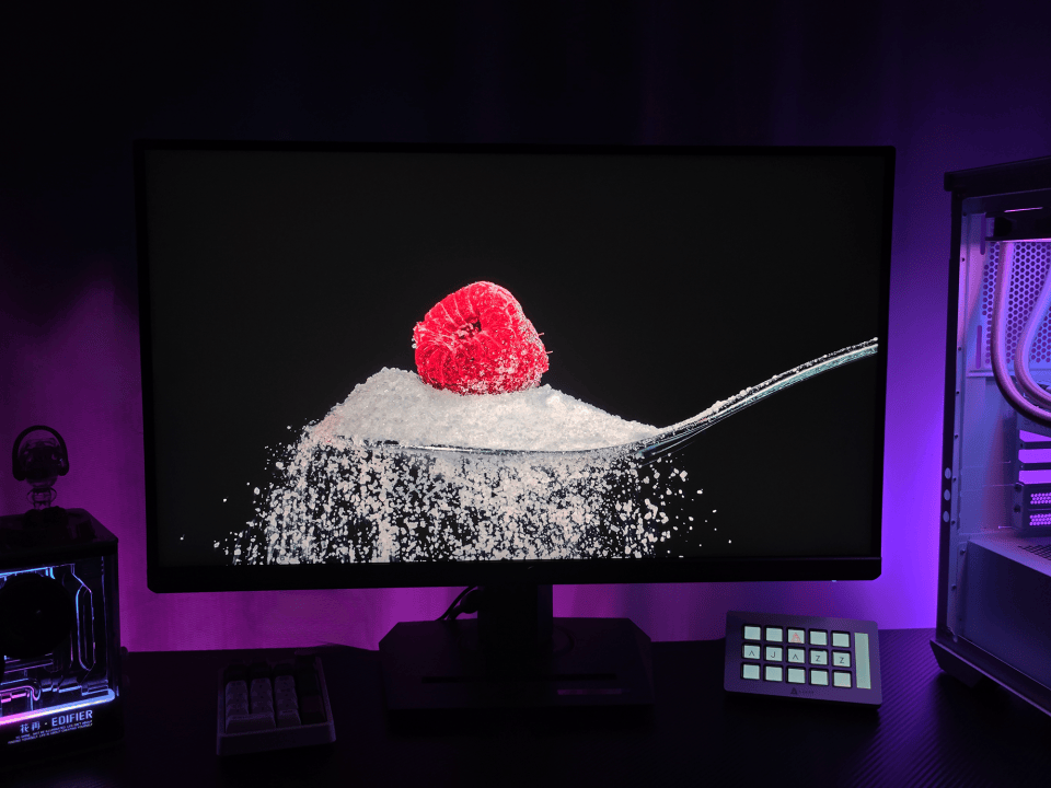 出厂的时候ROG就对每台显示器进行了严苛的色彩校准,到手我们就可以直接使用。亮度方面显示器在标准模式下为350cd/平米,在HDR模式下峰值亮度为400cd/平米,并且通过了VESA DisplayHDR 400认证。不错的亮度搭配HDR下的100000000:1超高动态对比度,显示器画面的明暗细节愈加丰富,亮晶晶的白色糖粉从勺子中撒落下来的精美清晰效果更加震撼。
