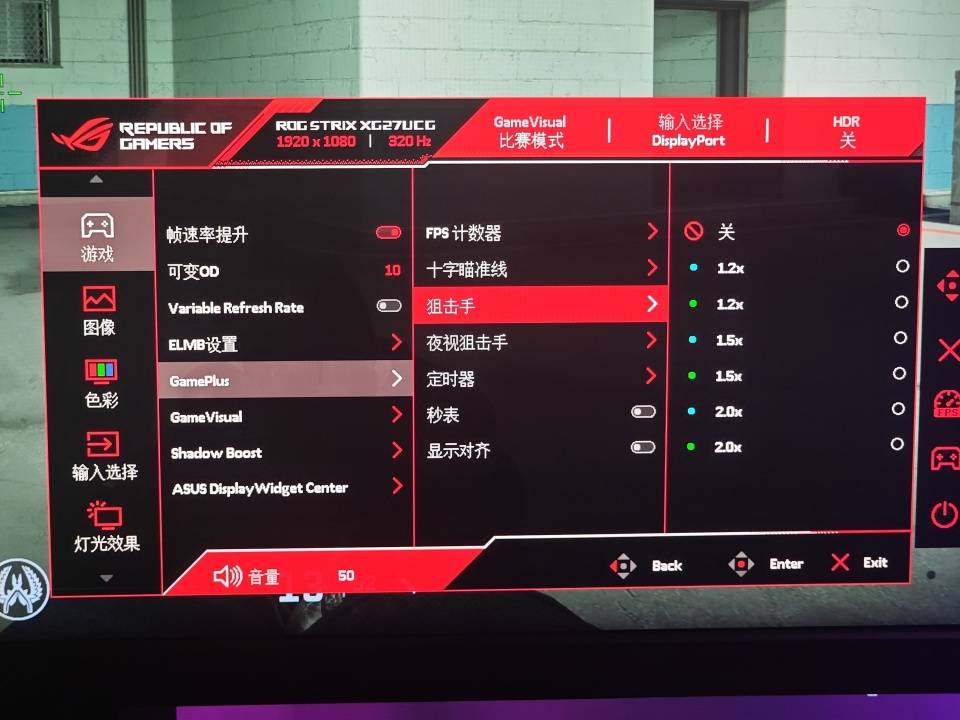 为了进一步提升玩家的游戏体验,ROG绝神27Pro还支持基于AI的GamePlus 技术,开启这个功能进入游戏,显示器会实时分析屏幕上正在显示的内容,从而精确的自动调整瞄准十字线,尤其能提高跑动中的射击准度,使用这个功能就像开挂一样大杀四方,自信心满满。另外如果你喜欢玩狙击,显示器还准备了狙击手、夜视狙击手两种特别模式。至于常规的定时器、FPS计数器、秒表、显示对齐功能也是一样不少。