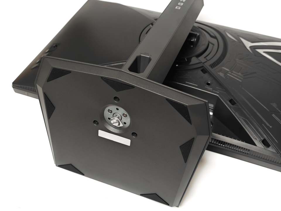 显示器正面采用了三窄边框设计,灰色边框搭配银色的信仰之眼十分精致耐看,宽大稳固的底座上面还有一个插槽可以用来放手机或笔。