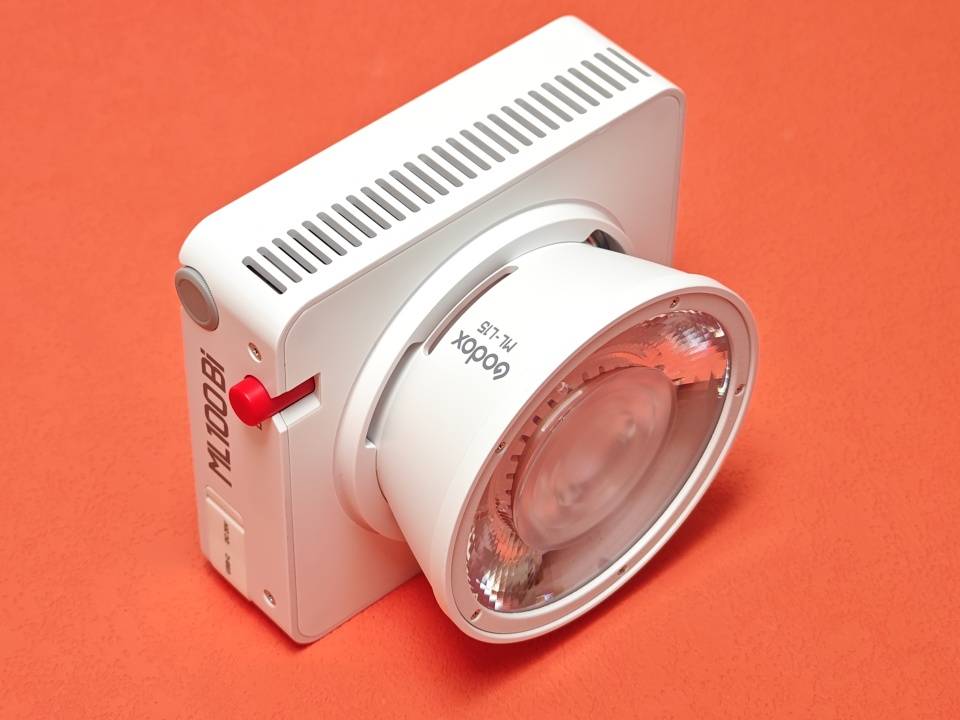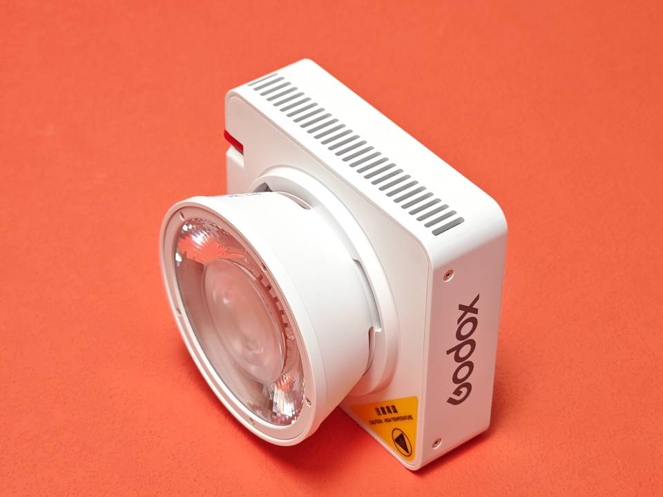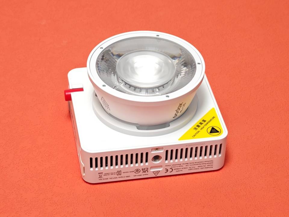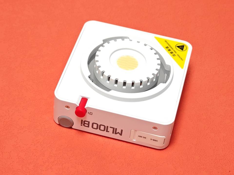 当我看到神牛ML100Bi那一刻,不禁感叹现在的灯真的是越做越漂亮、越来越小巧,灯的正面采用正方形外观设计,边角都进行了弧度处理,纯白配色尽显时尚大气。中间的神牛卡口设计除了可以使用专属的神牛卡口配件,也可以通过保荣口转接环来匹配其它保荣口配件。