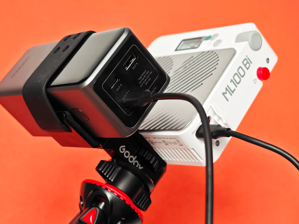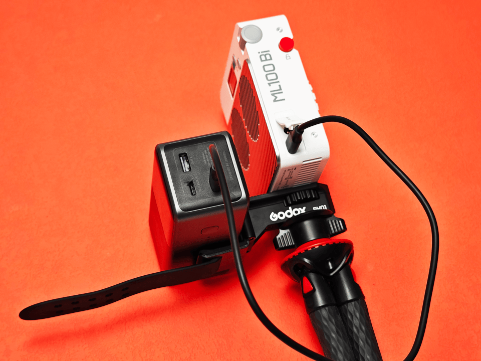 我们将绿联能量湃Pro 130W充电宝的100W USB-C接口与神牛ML100Bi的USB-C电源口相连,按住神牛ML100Bi的电源开关,就可一键点亮灯光。