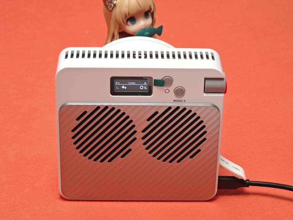 神牛ML100Bi的背面就像一个复古的收音机,最上面有一个液晶显示屏,左侧有一个电源按键、一个模式/蓝牙按键,最右边还有一个旋钮,底部凸起的银灰色区域采用波浪式斜线设计,立体感十足,让上面的两个风扇出风口都充满了艺术气息。