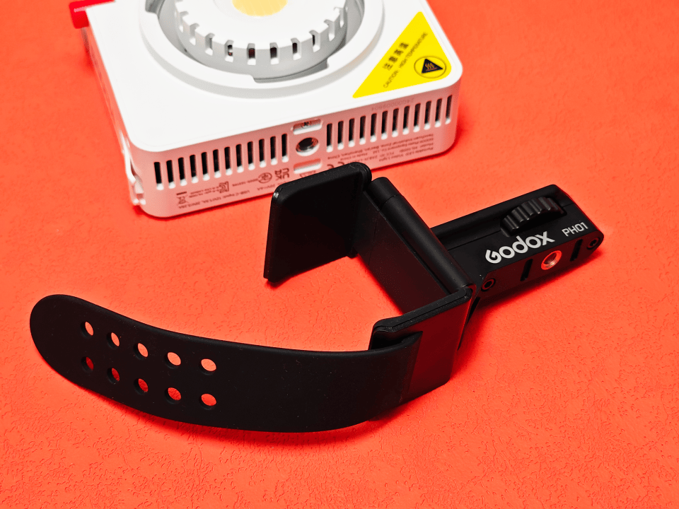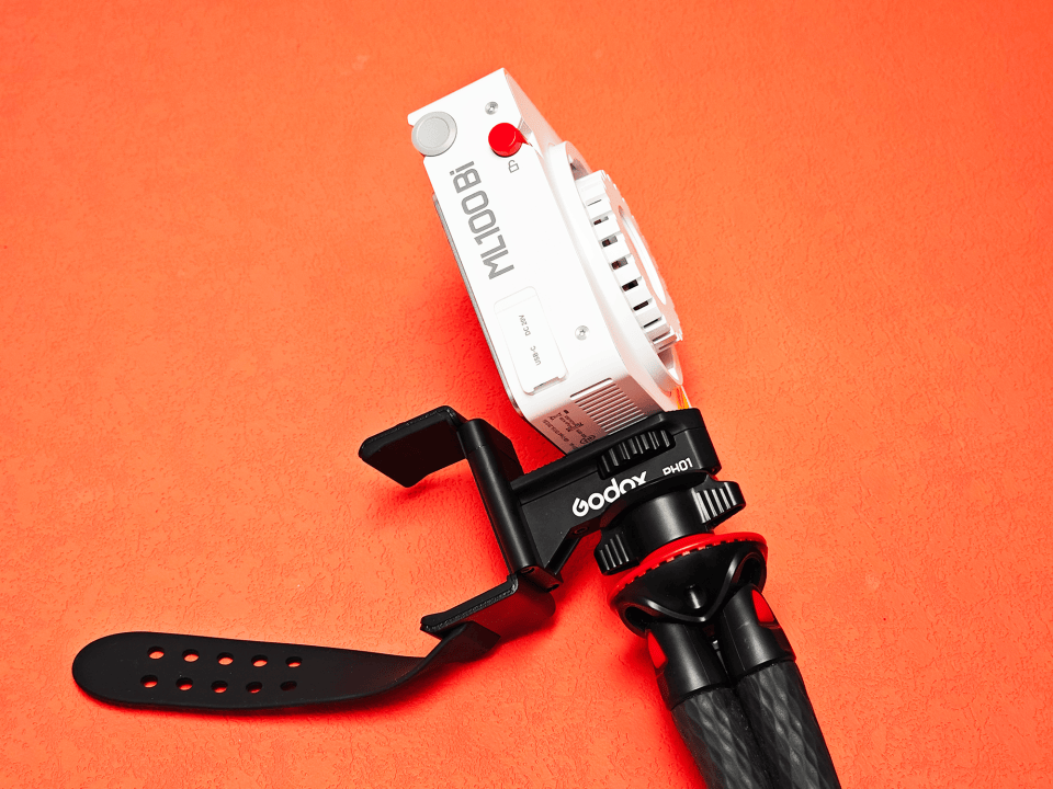 神牛ML100Bi支持移动电源供电,所以大家一定要选购移动电源支架PH01,电源支架采用黑色高强度塑料材质,前端有一个标准的1/4螺丝,通过下面的旋钮可以把神牛ML100Bi固定在支架上面。