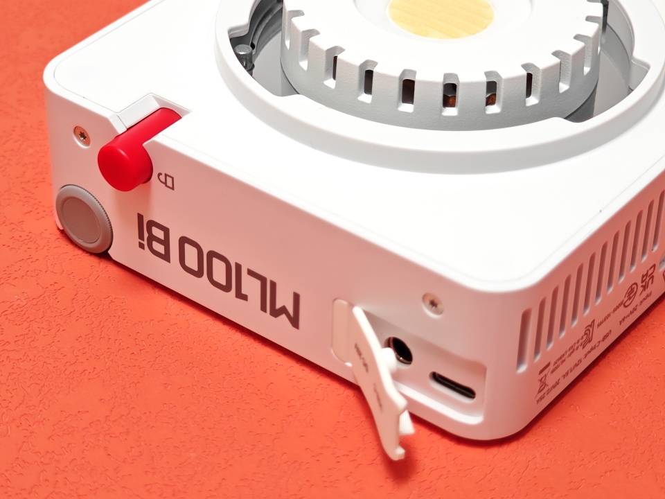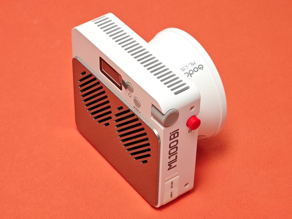 神牛ML100Bi采用扁平化设计,它的侧面比较纤薄,一只手就可以轻松掌握,平日出门也可以放在裤口袋或背包里,相比我那笨重的大灯,它的重量可以忽略不计。灯的左侧有一个红色按键,当我们要卸掉已经安装在灯上的配件时可以按一下这个红色按键。