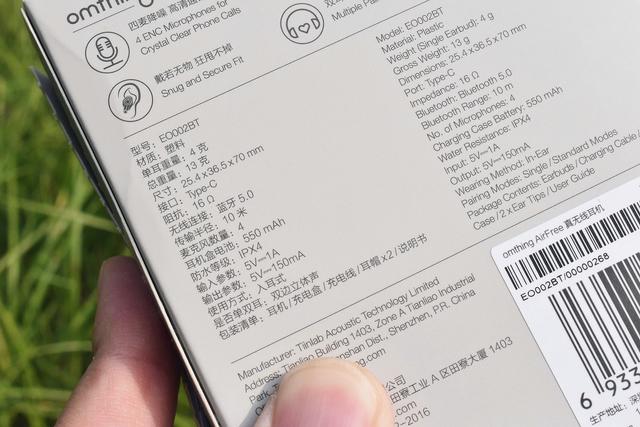 透过盒身背后的规参表可以得知,其具体型号为EO002BT,全身为塑质,总重量仅为13克,可以说是相当的轻盈。而最新的蓝牙5.0,以及IPX4级防水也都是支持的。虽只一张半不到,但看参数性能还是富有诚意的。