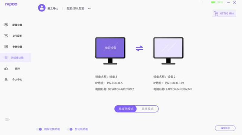 雷柏M+无线跨屏传输技术提供了局域网模式与离线模式两种操作方式,通过驱动软件内跨设备功能就可以实现切换两种模式与设备顺序,两种模式均需要无线接收器与鼠标相连才可以实现跨屏操作。局域网模式下,除了跨屏互联功能外,开启剪切板功能后,还可以在两台设备间复制粘贴内容,文字、图片,或是OFFIECE文档、视频、甚至1G大小的文件都可以使用这个功能传输到另外一台设备上,无需其它外置存储设备就能快速传输条件,操作简单方便,体验非常出色。离线模式下则仅支持跨屏互联功能,应对一些需要快速切换设备的场景下还是很有帮助的。同时,M+无线跨屏传输技术在局域网模式下最多可以实现6台设备之间的跨屏操作,也能更好满足多设备用户的使用需求了。