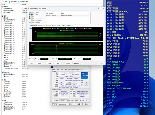 自动睿频到4.8Hz单烤FPU,,处理器功耗在218W左右,温度在84℃,核心温度在85℃上下波动。