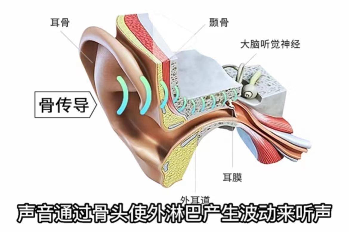 骨传导技术是一种通过颅骨将声音传递到内耳的音频传输方式。具体来说,当声音信号通过骨传导耳机的振动器传递到颅骨时,颅骨会将这些振动传递到内耳的耳蜗,耳蜗再将振动转化为神经信号,传送到大脑,从而实现听觉。与传统的气导耳机不同,骨传导耳机不需要通过耳道传递声音,因此避免了对耳道的物理压迫。