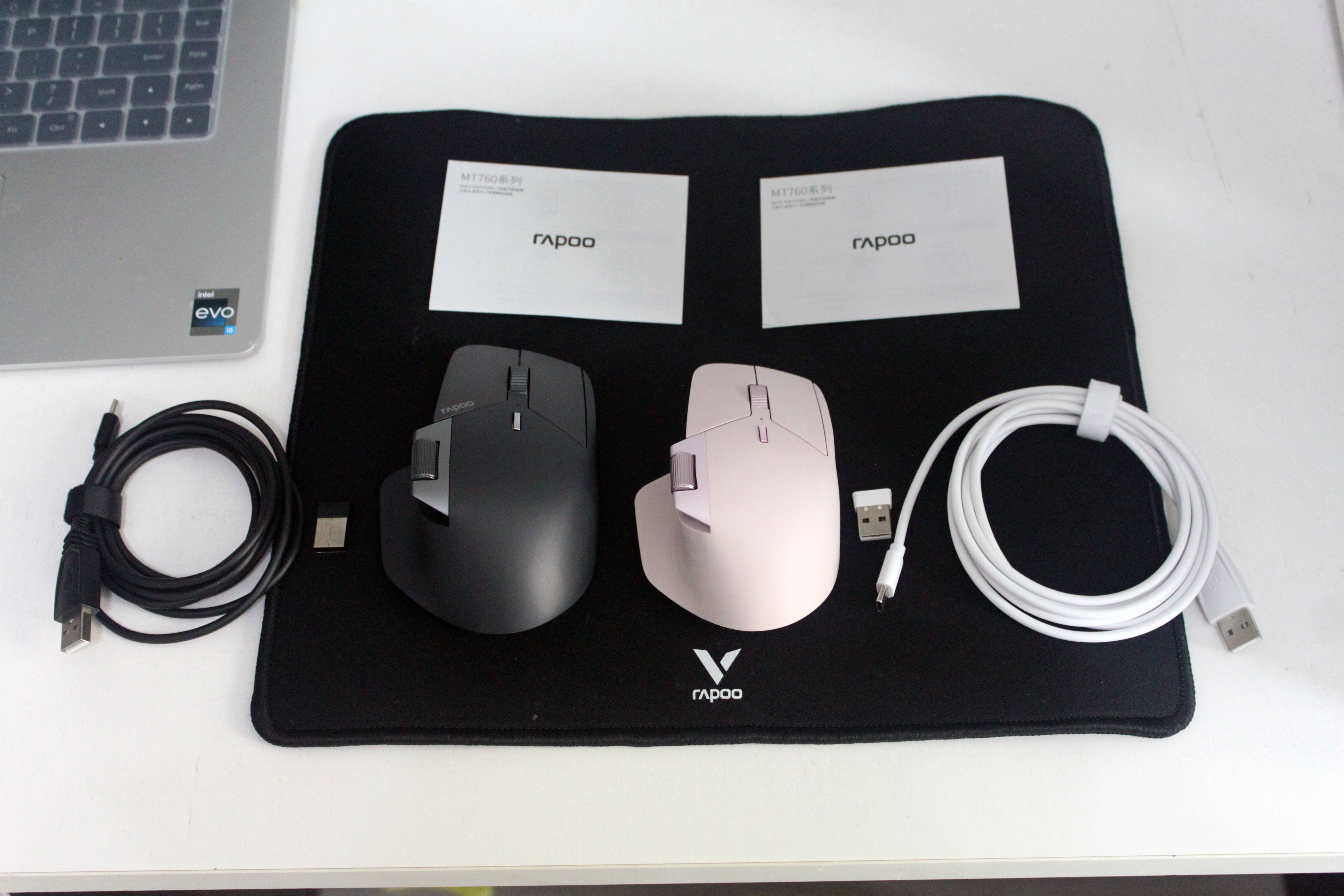 开箱后,可以看到产品搭配了鼠标一台、数据连接线一条、接收器一台和使用说明书一本。可以看到我入手的这套雷柏MT760系列鼠标是一黑一粉,黑色适合我来使用,粉色适合媳妇使用。