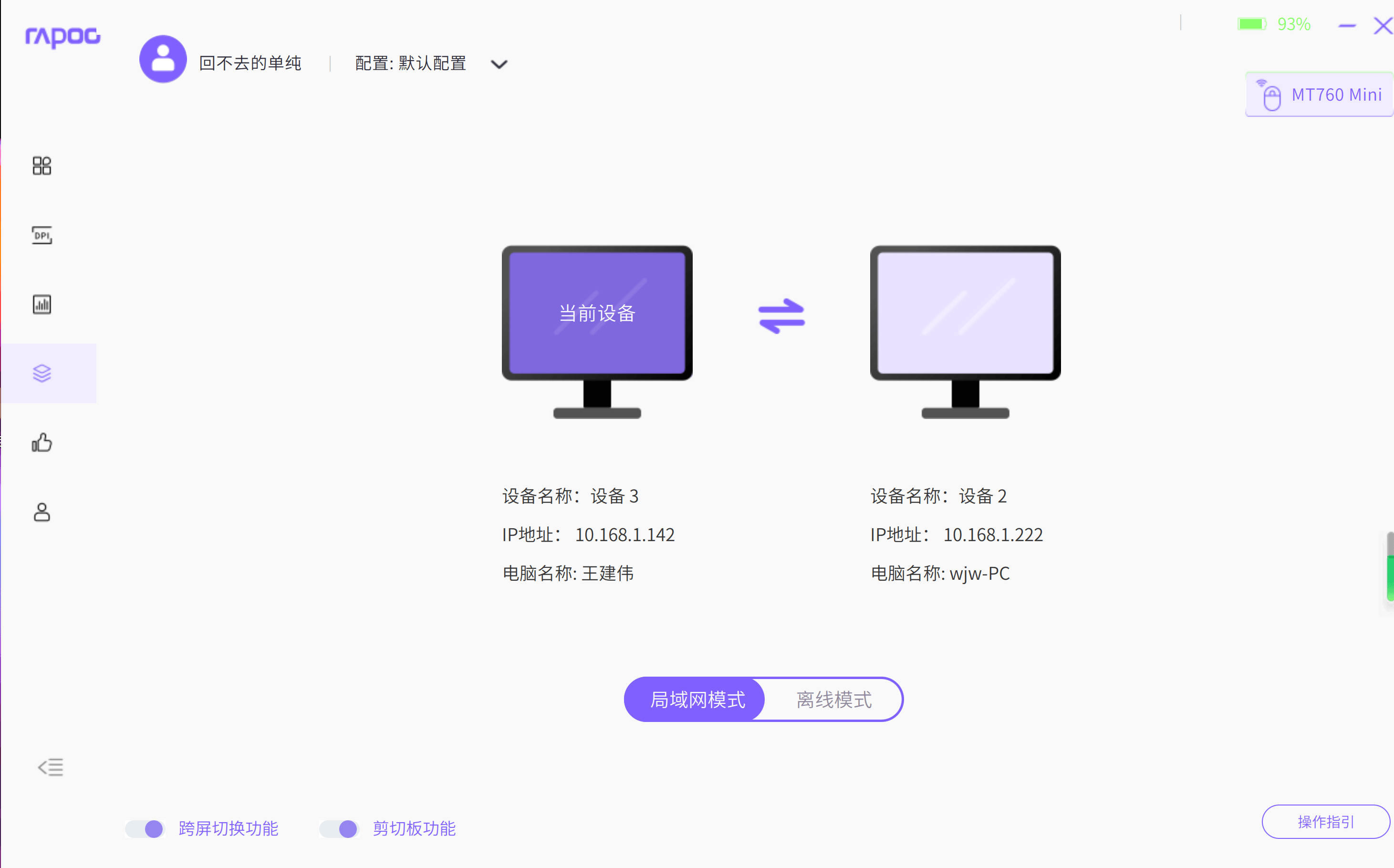 雷柏MT760系列鼠标的最大的一个亮点就是支持了雷柏M+无线跨屏传输技术,说句简单点的就是可以直接在多台设备之间直接进行文件、图像和文本的跨屏传输,可以从一台设备上直接快速移动到另一台设备上进行操作,实现多台设备的协同办公。我在一台设备上对照片进行复制,鼠标直接可以移动到另一台设备上直接进行粘贴,实现了快速跨屏传输,这个功能真的对我来说太好用了。
