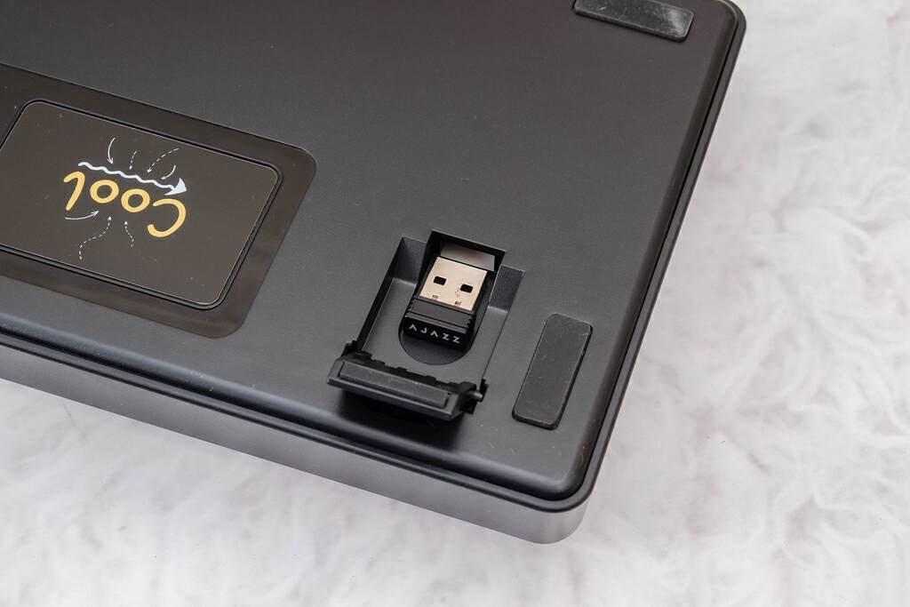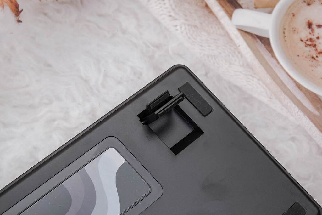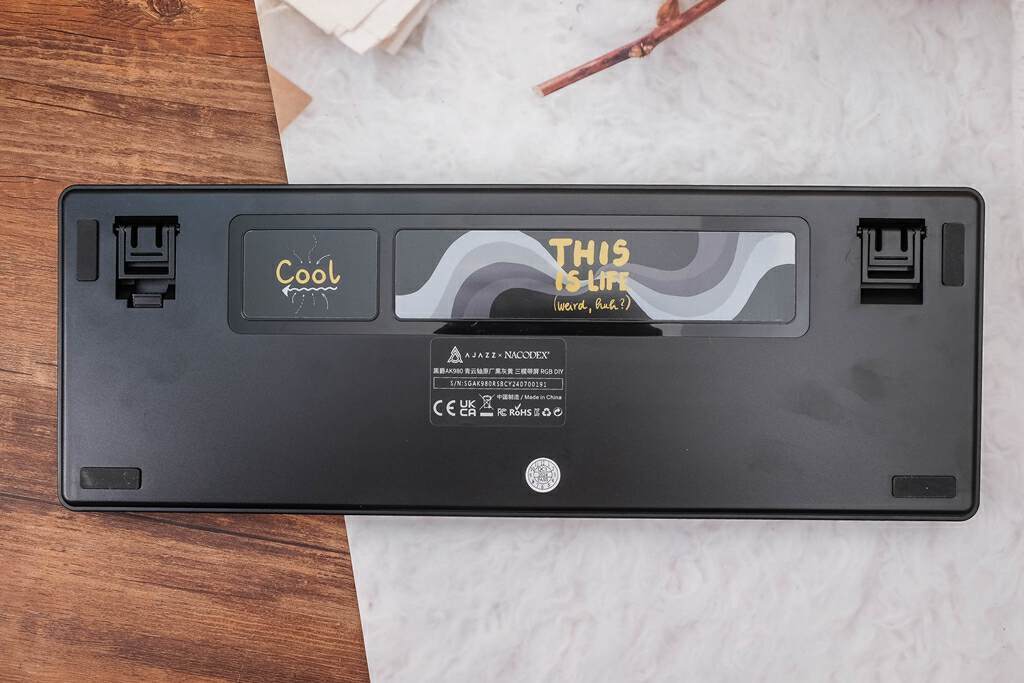背面带有个性插画,细节拉满。支撑方面则提供了一对二段式脚撑,可调节成三种倾斜高度,配合人体工学原厂高度的键帽,长时间打字很舒适。在其中一个脚撑上方收纳了2.4G接收器,空间利用的设计很大胆。