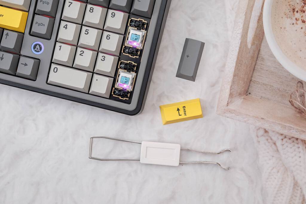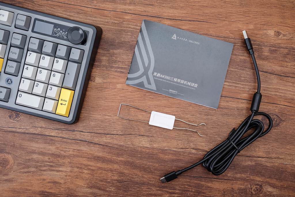外包装就不多介绍了,直接看看配件部分。除了黑爵AK980三模键盘,还带有USB-A to USB-C键盘线、钢丝拔键器、拔轴器和说明书。
