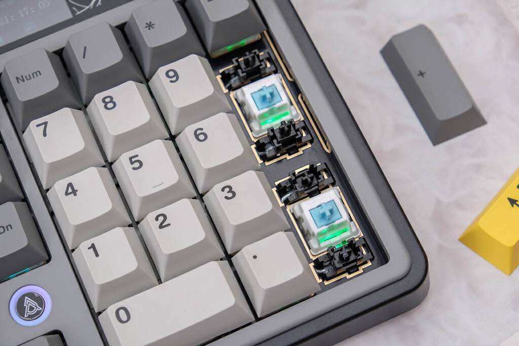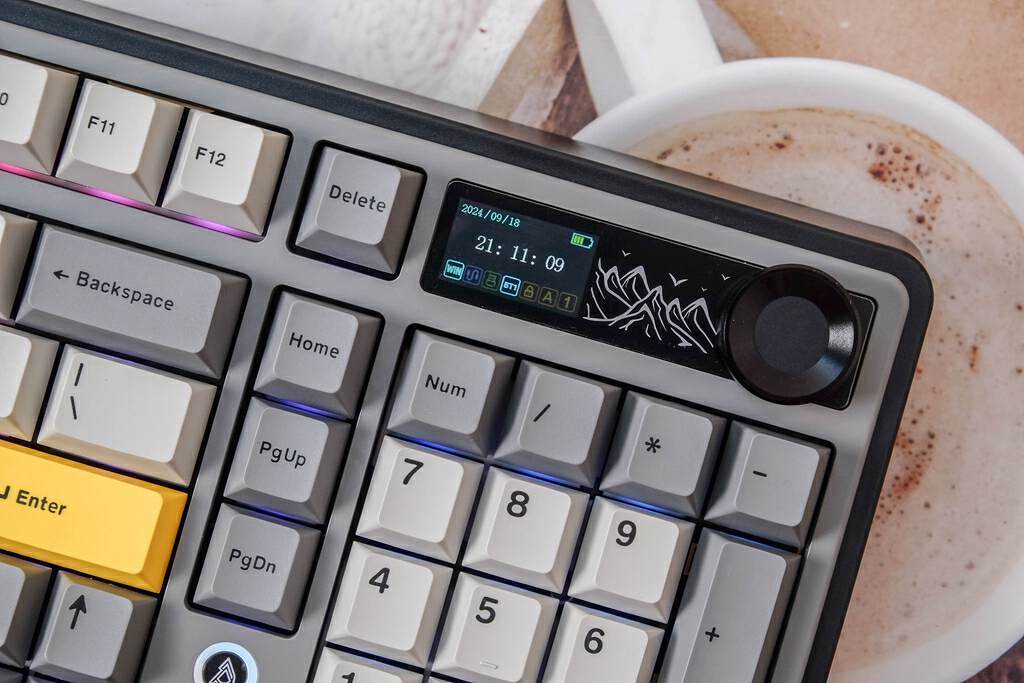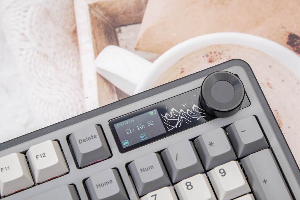 在右侧上方提供了一个1.14寸TFT彩色屏幕和一个金属旋钮,旋钮可以用于音量控制,屏幕则可以显示时间、连接模式、电量、自定义GIF动图等功能,目前是很多机械键盘的主流配置,可以显示当前的工作状态。