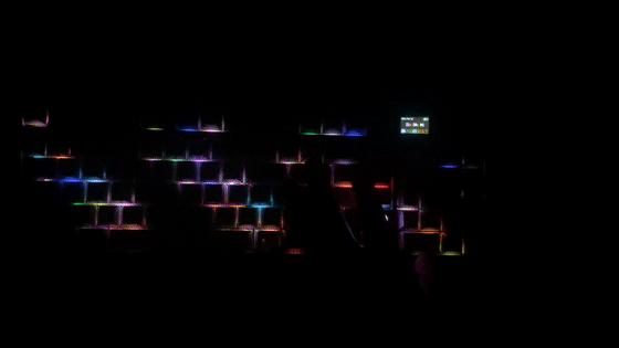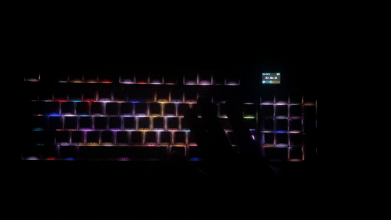 黑爵AK980三模键盘采用下灯位的RGB背光设计,提供了20种背光模式可选,有律动模式、单色循环模式,还可以选择常驻色律动模式,亮起来非常好看,随后也拍了几张动图供大家欣赏。