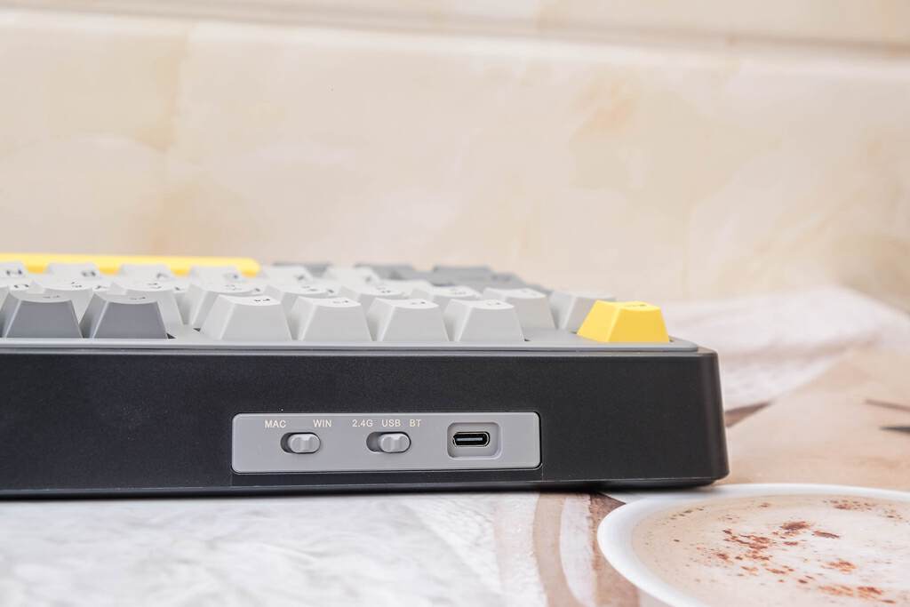 日常控制方面,带有MAC/WIN系统切换键、2.4G/USB有线/蓝牙切换开关,支持无线、蓝牙、有线三种连接方式,同时也支持win和mac系统切换。充电口为常见的Type-C口,内置了8000mAh大容量锂电池,搭载低功耗芯片和节能省电技术,无线连接下可使用28小时,关闭背光可使用110小时,续航表现已经很出色了,就算携带外出使用,也没有电量焦虑。