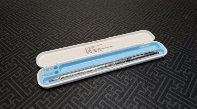 西圣pencil 2创新采用了半透明光感美学设计,能够直接清楚地看到内部各种元器件,呈现出十足的科技感和未来感。笔帽处是触摸开关,内置LED指示灯,单击轻触开机,长按3秒关机。另外,开机后,蓝色LED灯自动点亮并闪烁,进入蓝牙配对状态。笔尖为可替换式设计,同样采用了透明POM材质,3D微磨砂笔尖,细腻耐磨,精准灵敏,仿铅笔手感,能满足不同书写、绘画需求,而且安全可靠,不会划伤iPad屏幕。西圣电容笔内置了90mAh电池,支持磁吸iPad充电,续航长达12小时以上,能轻松应对长时间学习。笔尖内置倾斜传感器,可以根据不同的倾斜度创作不同粗细的线条。同时具有与原版同款的防误触技术,不用带手套也能搭在屏幕上,不影响书写绘画。