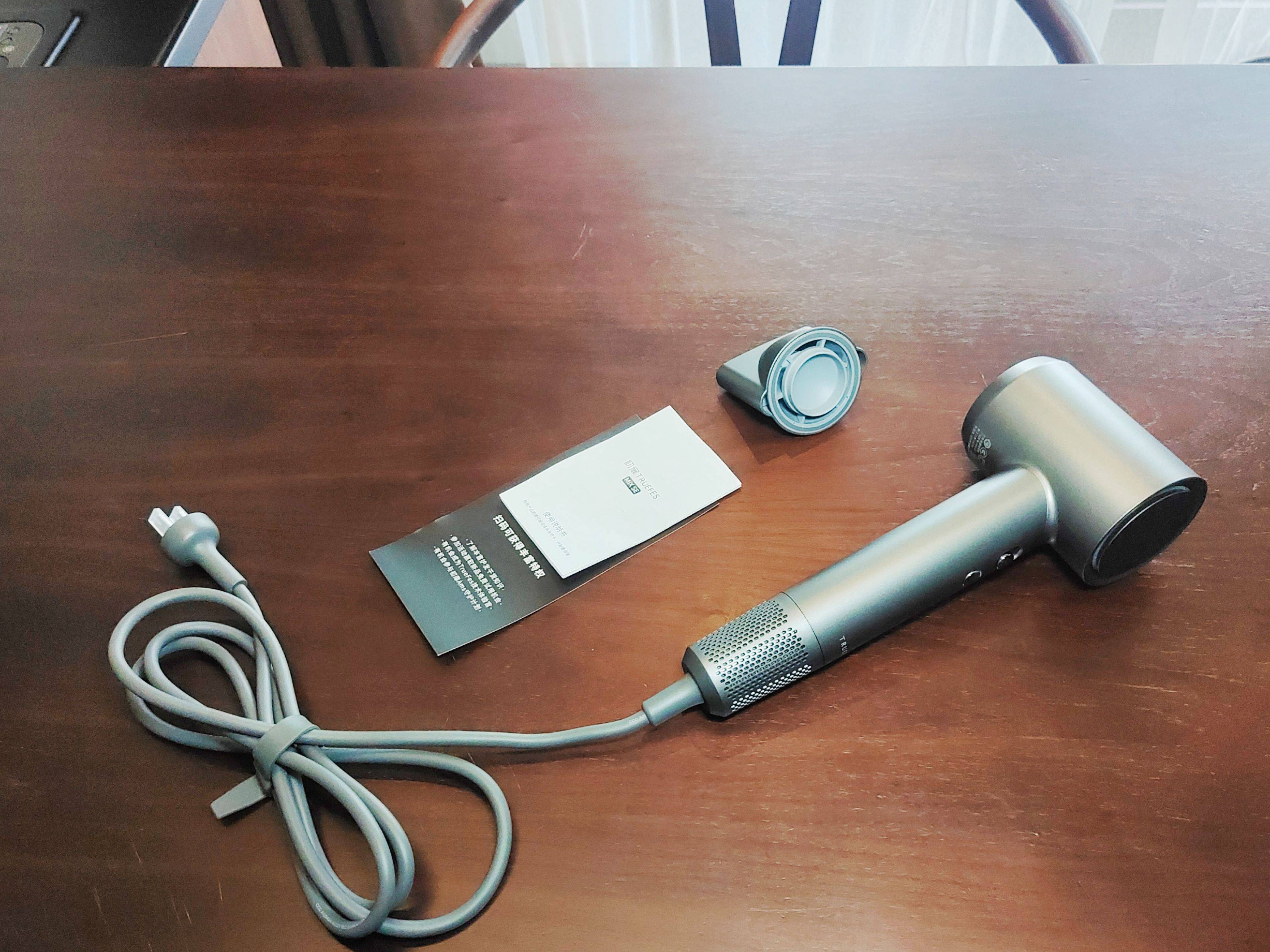 吹风机的附件有一个磁吸式扁口风嘴,一份折色说明书,一个1.5米长的电源线连接着银灰色的可爱吹风机。