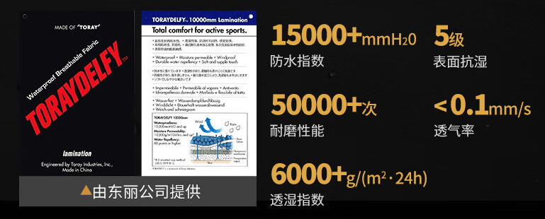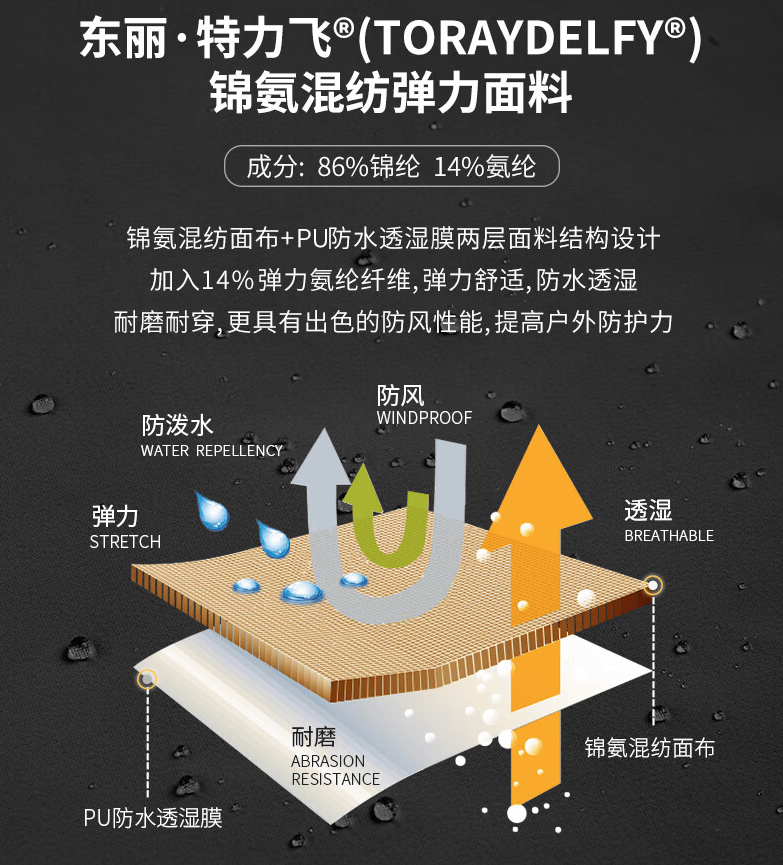 作为一款专为现代通勤者与旅行爱好者量身打造的多功能服装,黑冰御行者冲锋衣的面料有点特别,采用了东丽·特力飞TORAY DELFYR科技外壳面料,可以说集防风、防水、透气与耐磨等多功能于一体。
