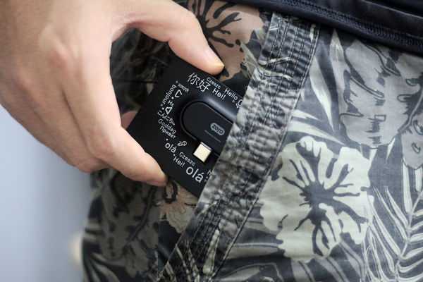 时空壶随身翻译机出厂状态下是一个黑色的卡套”保护”着的,当然后续的非使用状态下,我们还可以拿它当收纳工具使用,卡套设计的很有意思和很能够展示产品的特性,正面印有不同语言文字的“你好”。