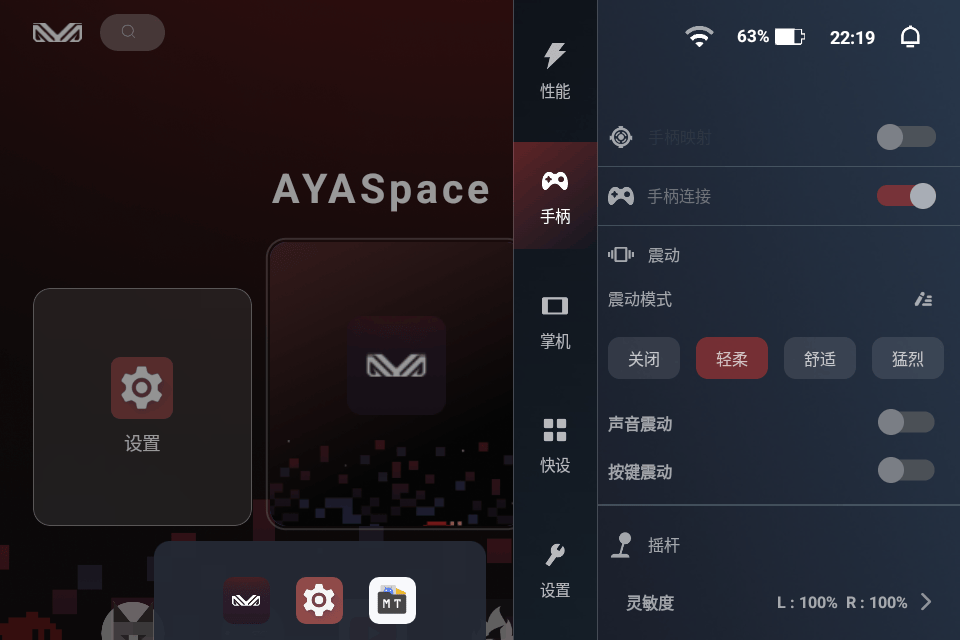 AYANEO Pocket MICRO居然还支持调整震动模式,自研软件AYASpace让交互更上一层楼,也可对声音震动、按键重点、灵敏度等进行调节。