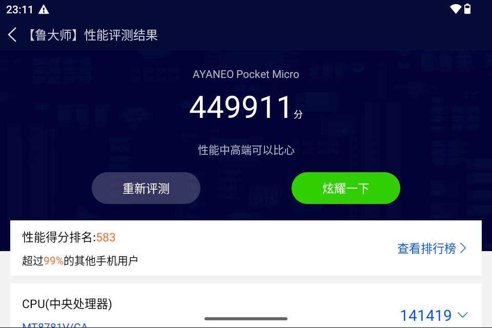 AYANEO Pocket MICRO经典袖珍小掌机的亮点还是挺多的,我将挑一些大家比较关心的话题来谈一谈。首先,在上一篇“真机鉴赏”中有小伙伴表达了对于性能跑分有点兴趣,这...真的要跑吗?那就来一次吧,联发科Helio G99处理器成绩在449911分。