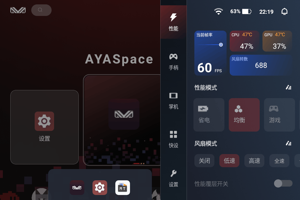 AYASpace键是AYANEO Pocket MICRO的“灵魂”所在,轻按进入快设小窗,长按进入游戏前端,这就是与市面上“廉价”塑料复古掌机的区别,AYANEO家给你的并非冰冷冷的机器,而是在各项细节上都做了优化,简单来说就是这款掌机的系统、UI、特色点都是经过细心维护,软件生态比较完善。