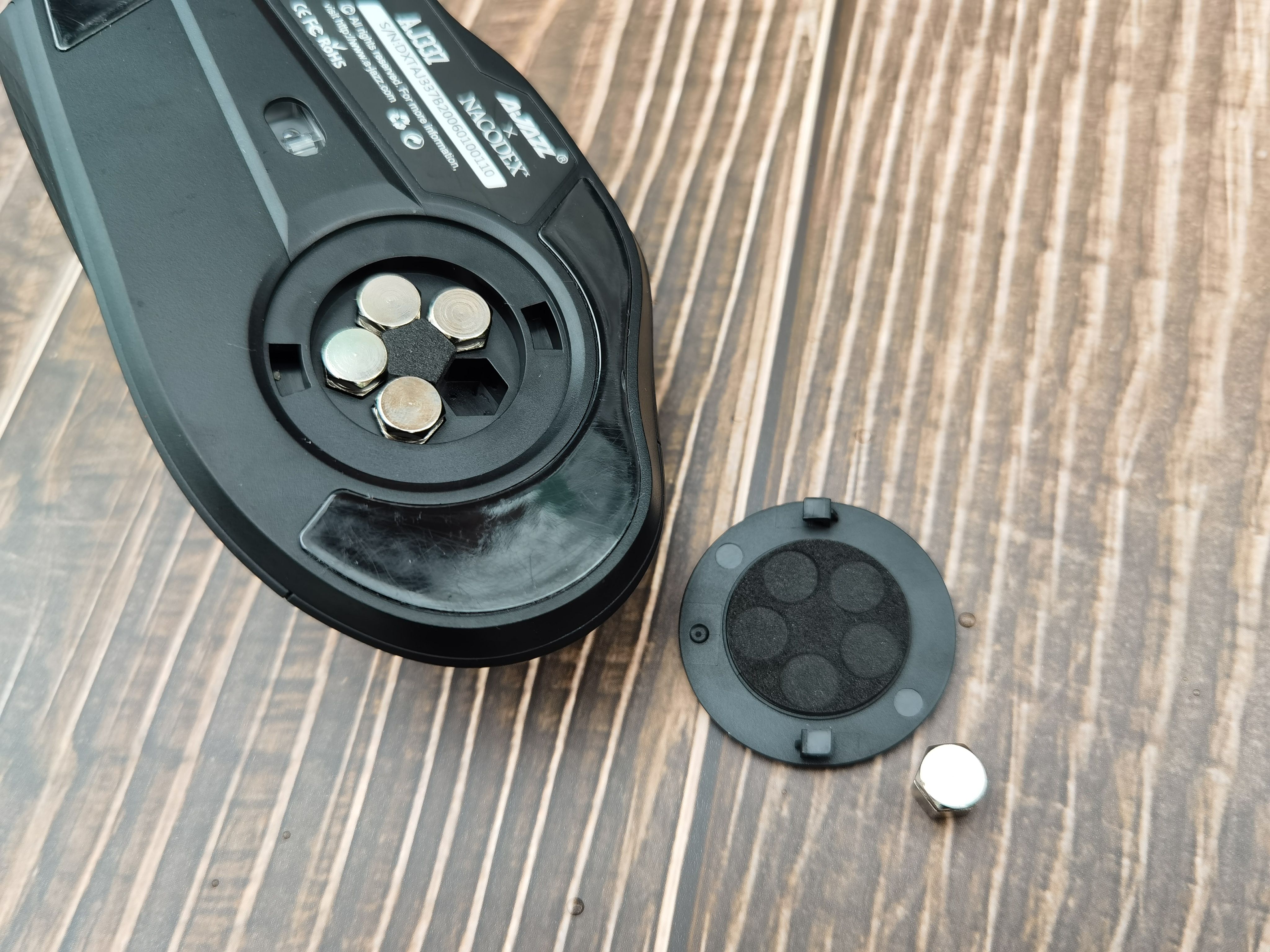 将黑爵AJ337底部可旋转部分打开,可以看到5个金属六边形,这是配重金属,一个金属六边形是1g重量,可供玩家根据自身手感自行调整配重,达到自己专属游戏鼠标的功效。