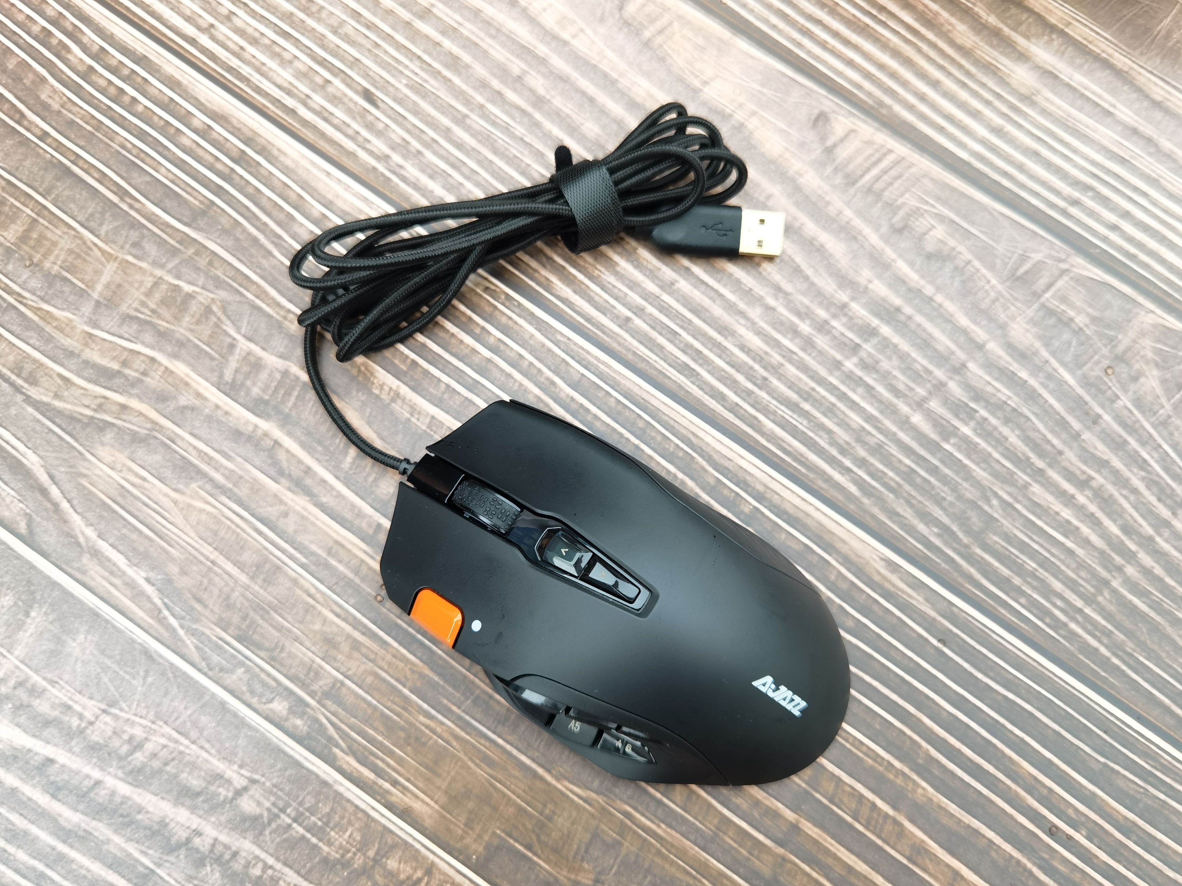 黑爵AJ337正面可以看到共有5个按键,加上一个滚轮按键,在橙色按键旁还有一个白色指示灯,在鼠标的最下角有白色品牌LOGO。