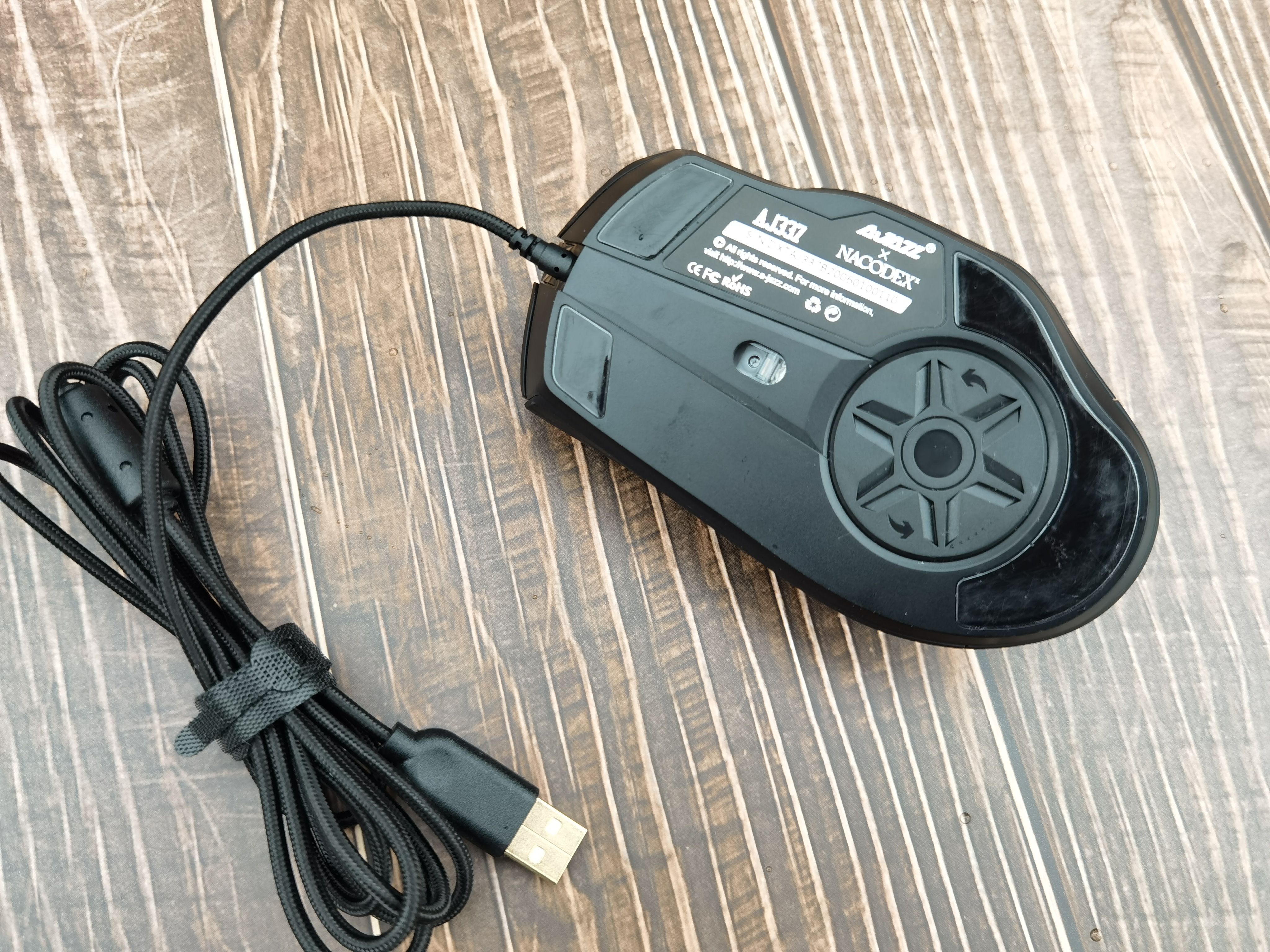 在黑爵鼠标的底部,印刷上品牌型号,指示灯,还有一个圆形可供旋转配件。在鼠标底部一圈留有防磨的凸起部分,这是在游戏摩擦,起到保护底部其他部位的作用。