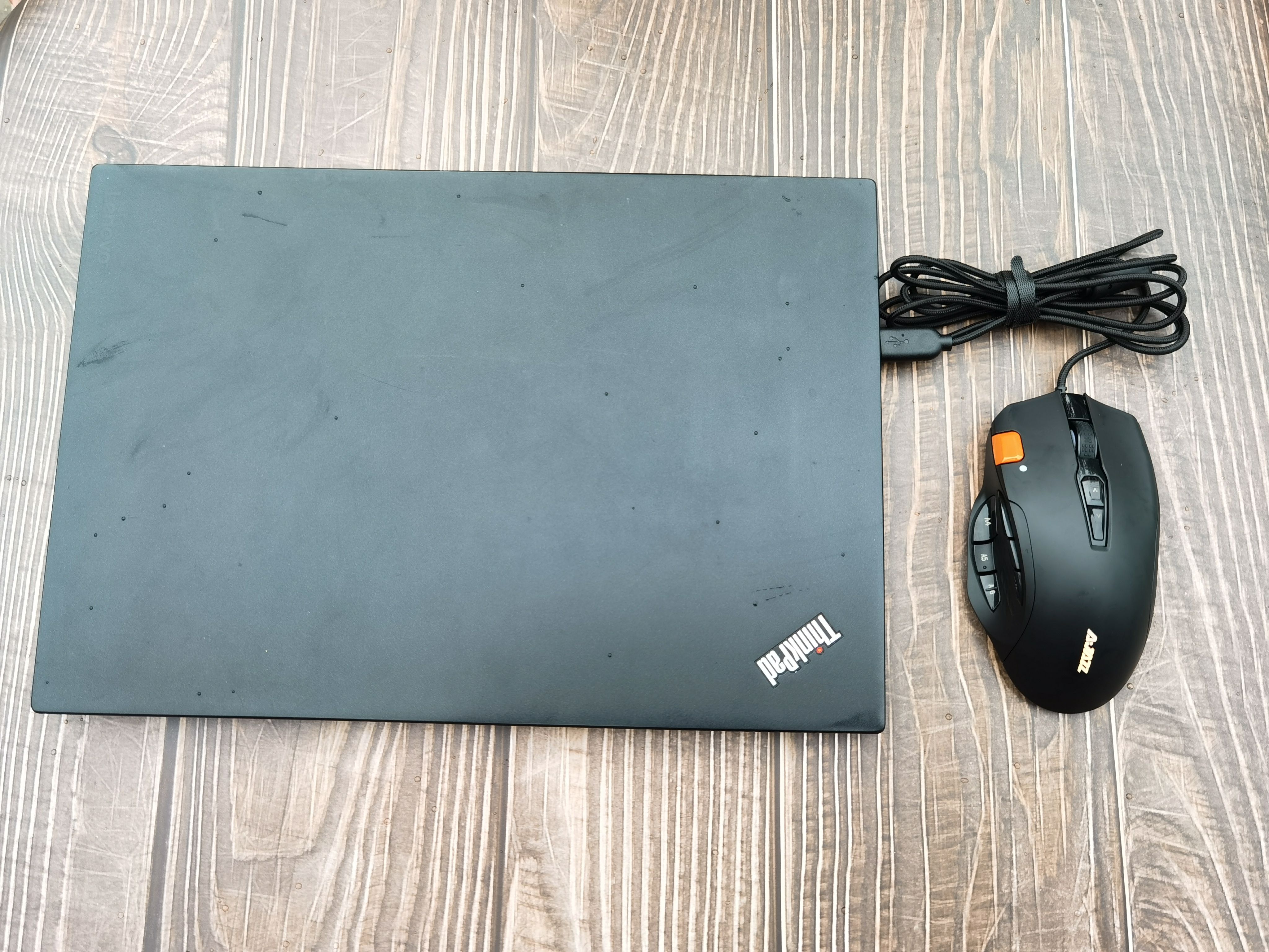 笔者配备的笔记本虽然是ThinkPad T460s,但是在日常的游戏中还是可以完美运行的,所以今天笔者就用这台笔记本来进行测试黑爵AJ337。在黑色鼠标配上黑色笔记本,这时候黑色的鼠标是那么的漂亮,显眼。