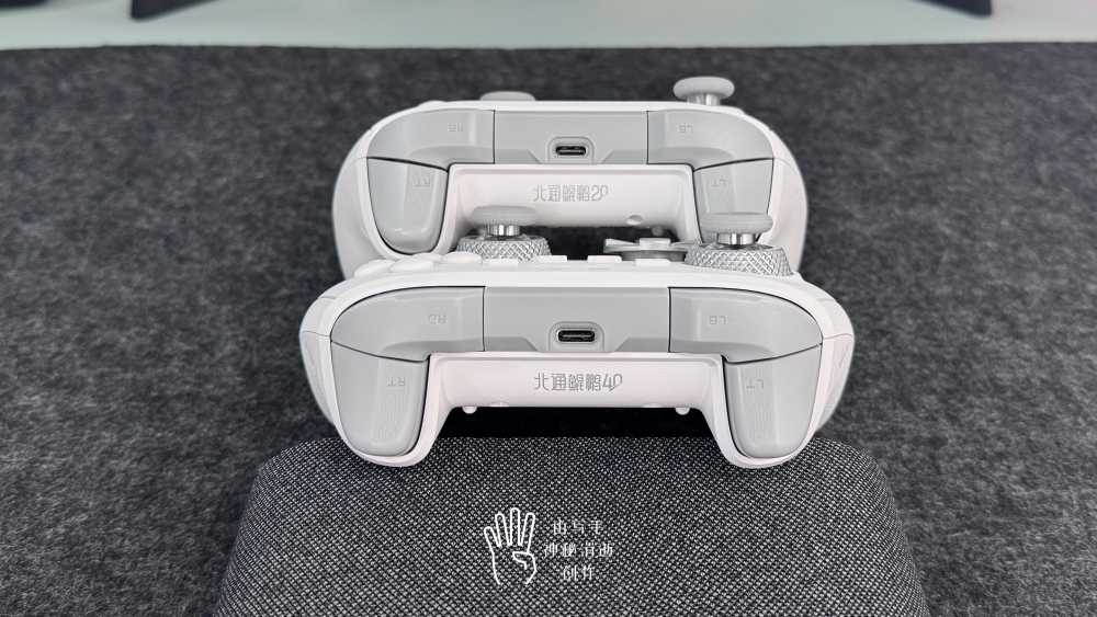 ▲外观上的不一致可以清晰辨别的是,鲲鹏40左右摇杆的无极旋钮、十字键键帽镀铬处理以及左右握把条形灯带凹状下沉修饰。