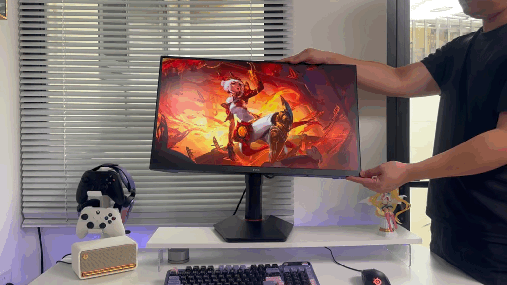 HKC G27H7Pro 显示器的主体与支架采用了便捷的快接设计,安装过程十分省心。用户只需将显示器背部的卡口对准支架的插槽,轻轻一推,伴随着 “咔哒” 一声即可完成固定,无需额外工具。