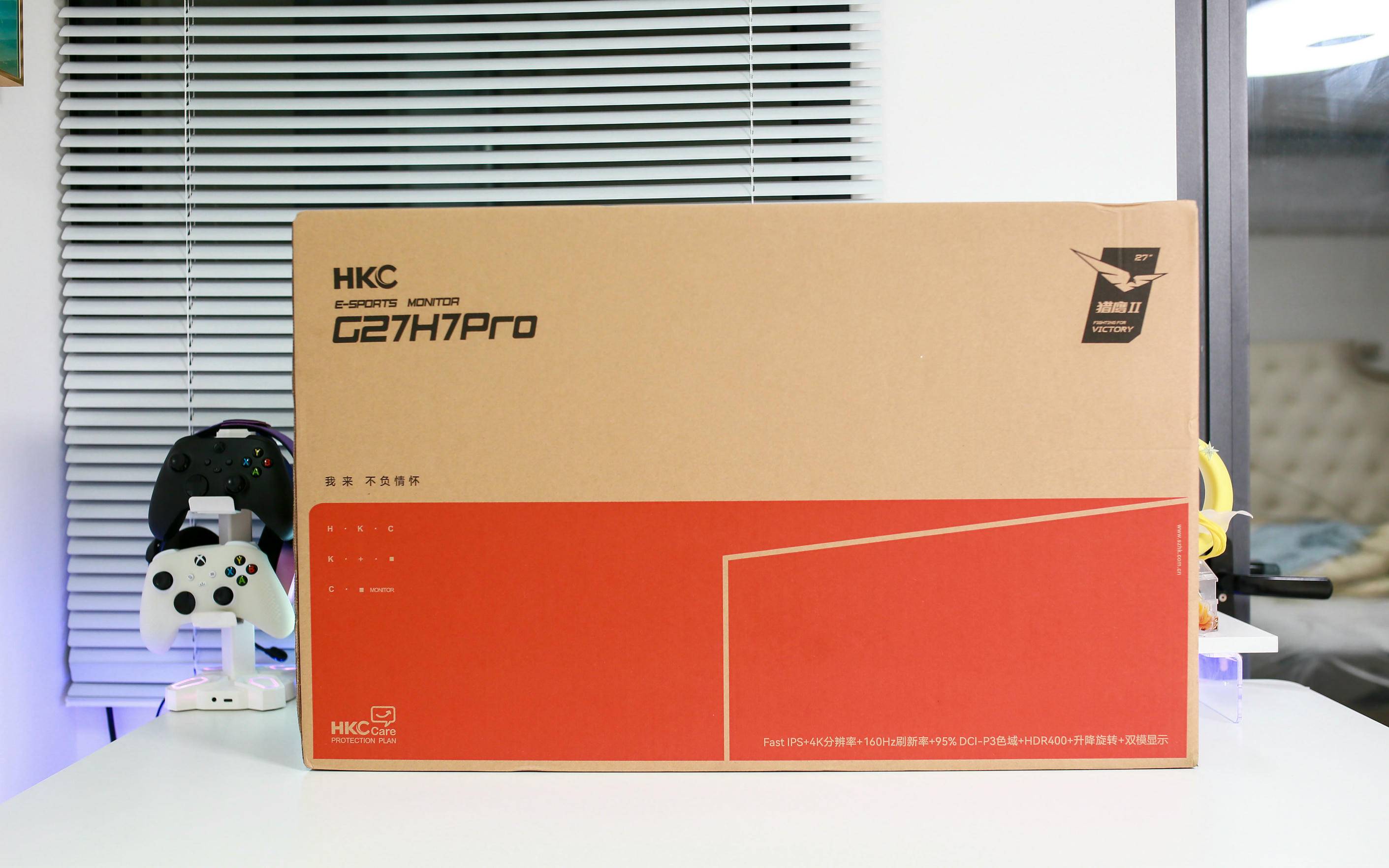HKC G27H7Pro 双模电竞显示器的包装比简约,环保牛皮纸箱。拆开后,内部显示器和配件没有任何问题,可见包装防护还是非常到位的,有效规避运输途中产品受损。