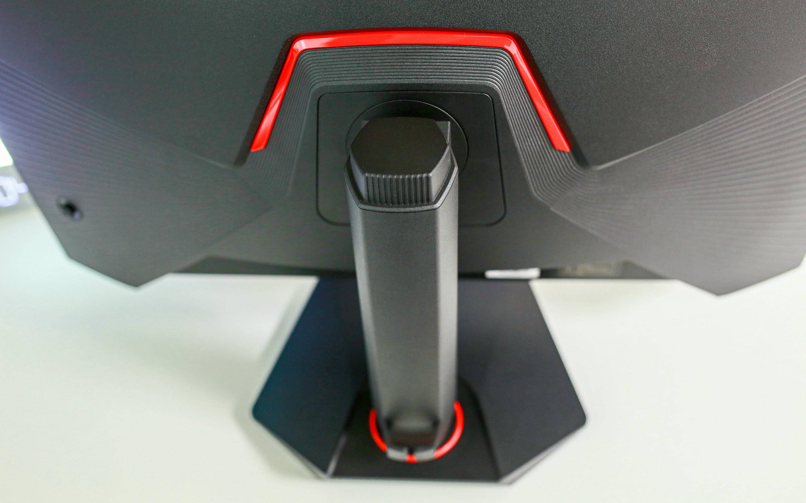 安装完成后,我们来看看这款 HKC G27H7Pro 双模电竞显示器的设计细节。整机采用经典的黑配色,搭配红色点缀。设计灵感融合了猎鹰和电竞元素,背部的鹰翼图腾展现出雄鹰展翅翱翔的姿态,传递出力量与速度的象征,既沉稳又充满竞技气息。