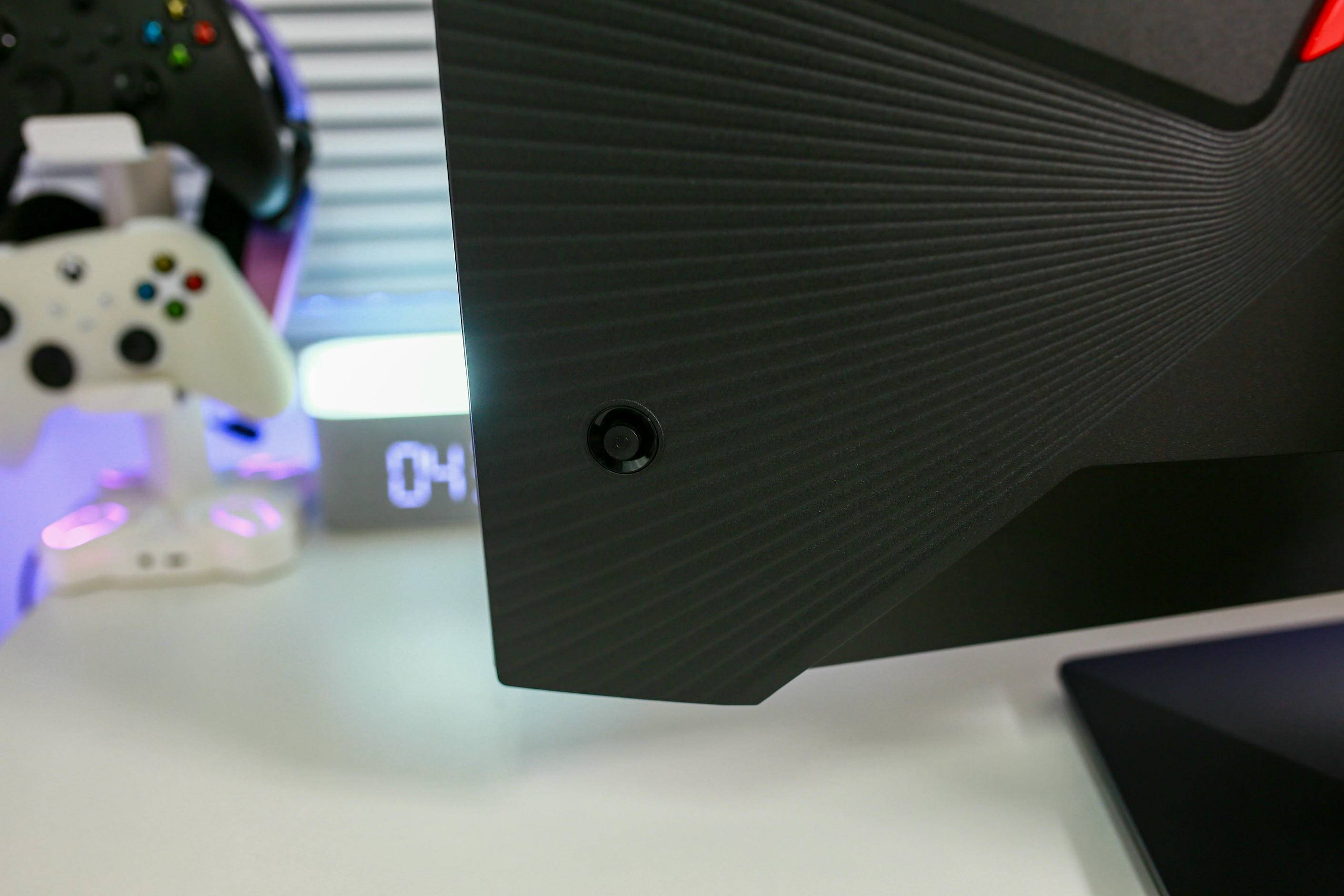 显示器的按键集中设计在背部右侧,方便用户随手操作。按键摇杆上下左右,分隔清晰。操控部分包括功能摇杆、开关按键和显示器电源键,细节处理也颇为用心,表面配有防滑条纹。用户可通过摇杆的按压及四向拨动,轻松实现多种 OSD 菜单调节,带来丰富的操控体验和直观的设置流程。
