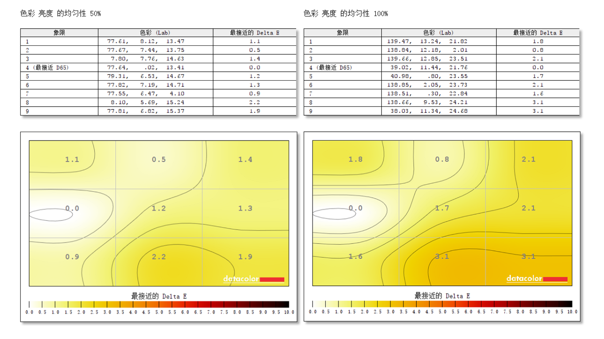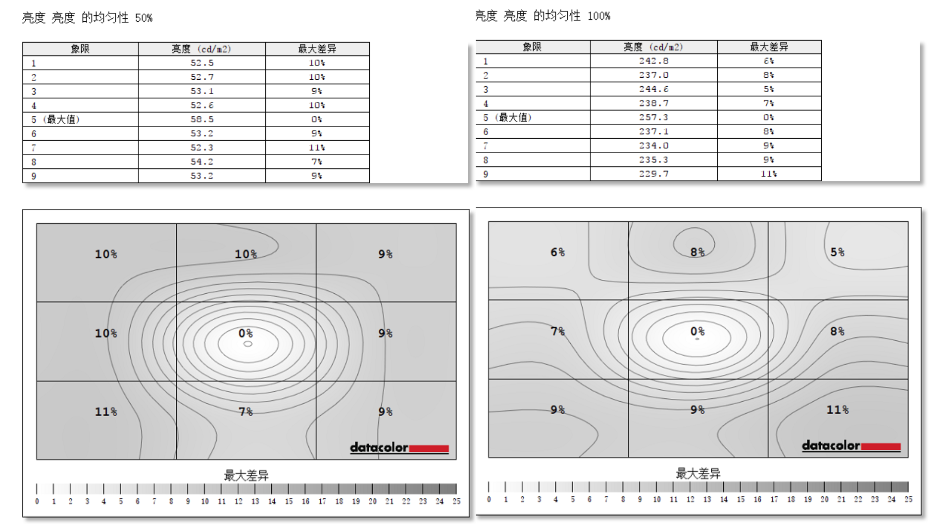 HKC G27H7Pro 显示器在 50% 亮度下,区域 7 的亮度偏差最大,为 11%。当亮度提升至 100% 时,区域 9 的偏差同样达到 11%。虽然 10% 左右的偏差控制在合理范围内,但通过校色时适度提升亮度,可以明显改善亮度均一性,使屏幕整体亮度分布更加均匀。这不仅提升了观看时的视觉舒适度,也确保了在游戏、设计或观影时获得更一致的画面效果。