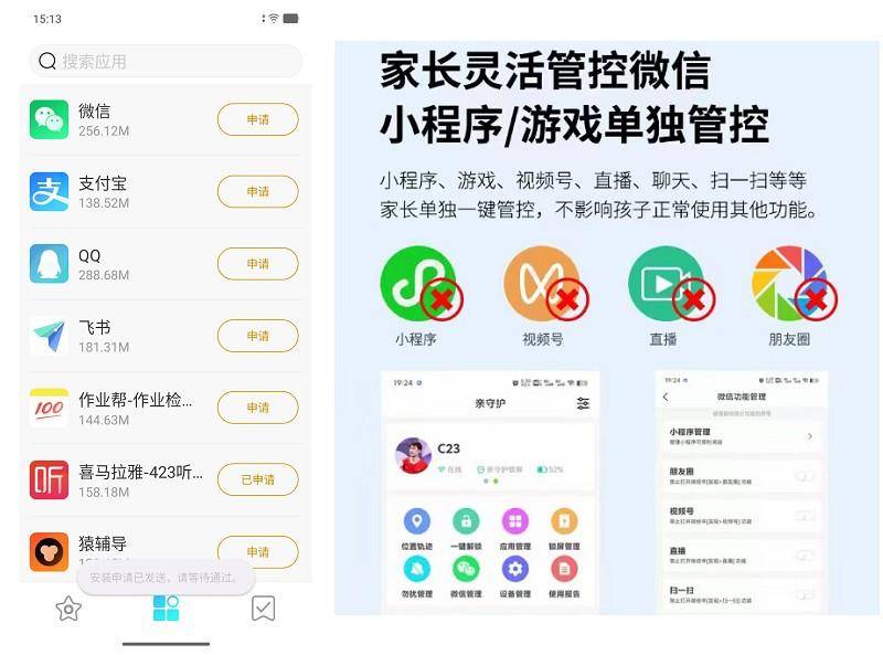 多亲C23防沉迷学生手机为家长提供了亲守护APP,绑定后,孩子的手机在安装所有应用前都要经过家长端的同意才能安全安装。而且每个娱乐应用的使用时间也会被严格限定。通过设置每日使用时间上限,家长可以有效避免孩子沉迷手机。一旦超出限制,手机会自动提示家长,并限制继续使用。