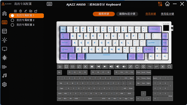 当然,除了硬件方面的出色表现,黑爵AK650机械键盘在软件方面也有着不俗的实力,搭配原厂驱动让键盘带来更多可玩性,比如说输入配置、灯效,上传喜欢的GIF图片做屏保等等。