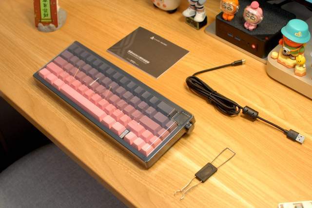 包装内的物品展示,键盘、数据线、二合一拔键器、说明书这些都是标准配置,另外还有个防尘罩,好评!