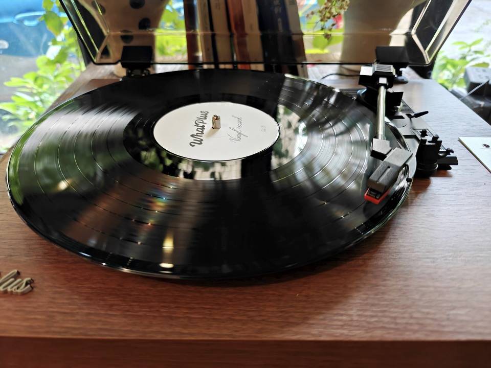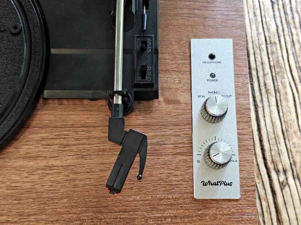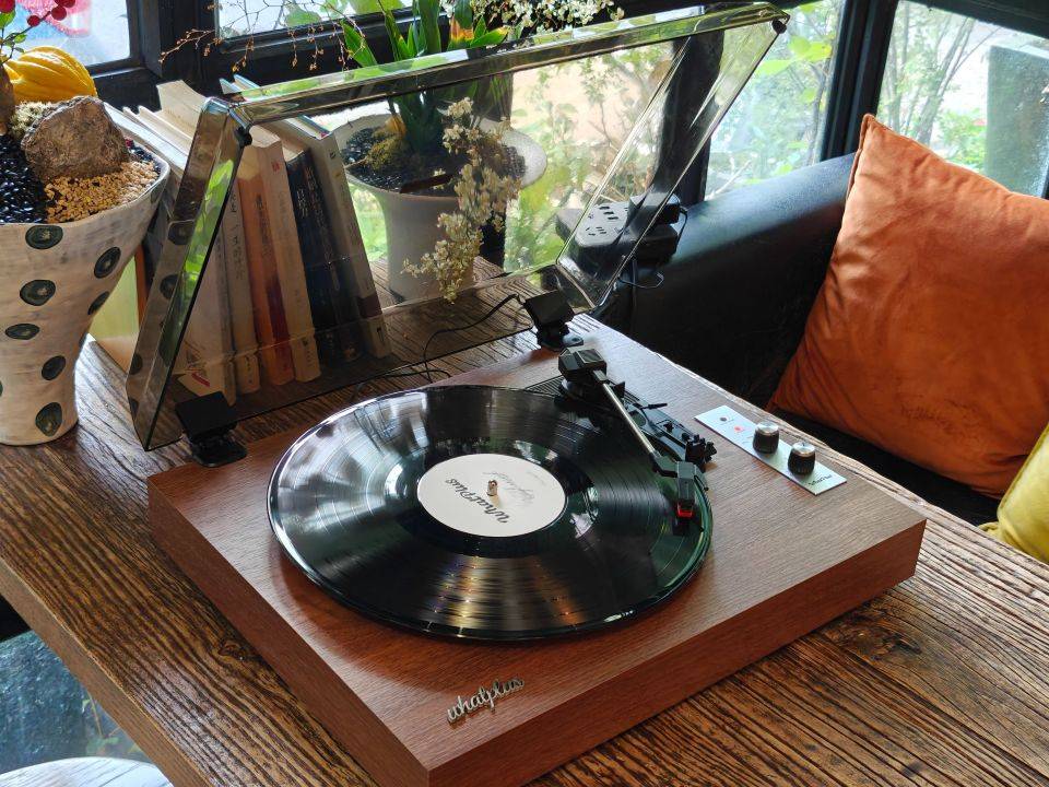 掀起透明上盖,就可以看到黑色的唱盘、灰色的金属唱臂、红色的唱头,左下角为WhatPlus铭牌,右侧为开关区域。