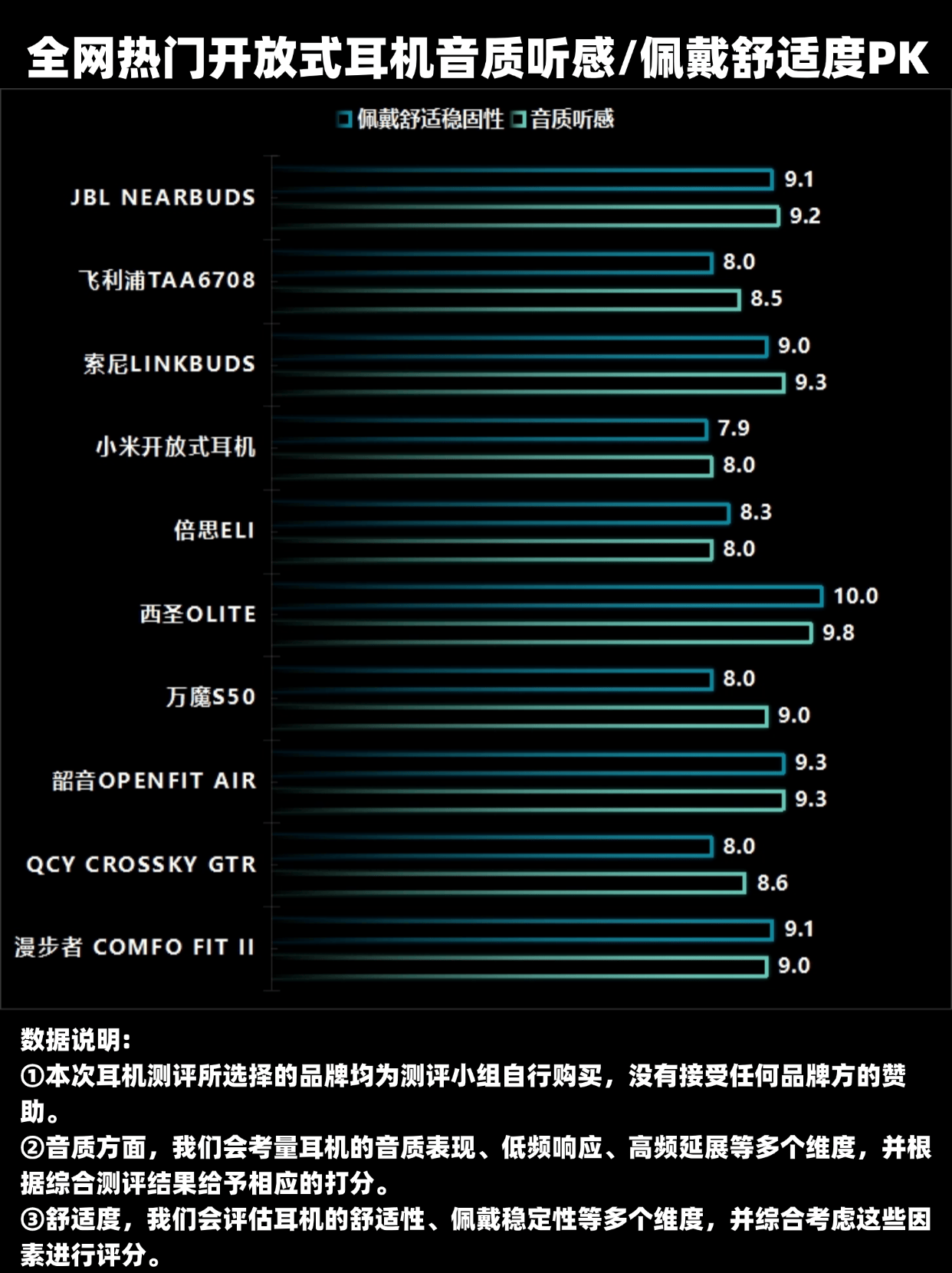 阅读完攻略后,我还为大家准备了市面上十款开放式耳机的舒适度与音质对比图,所有数据基于专业评测,帮助大家快速识别出高品质耳机并避免不合格产品。