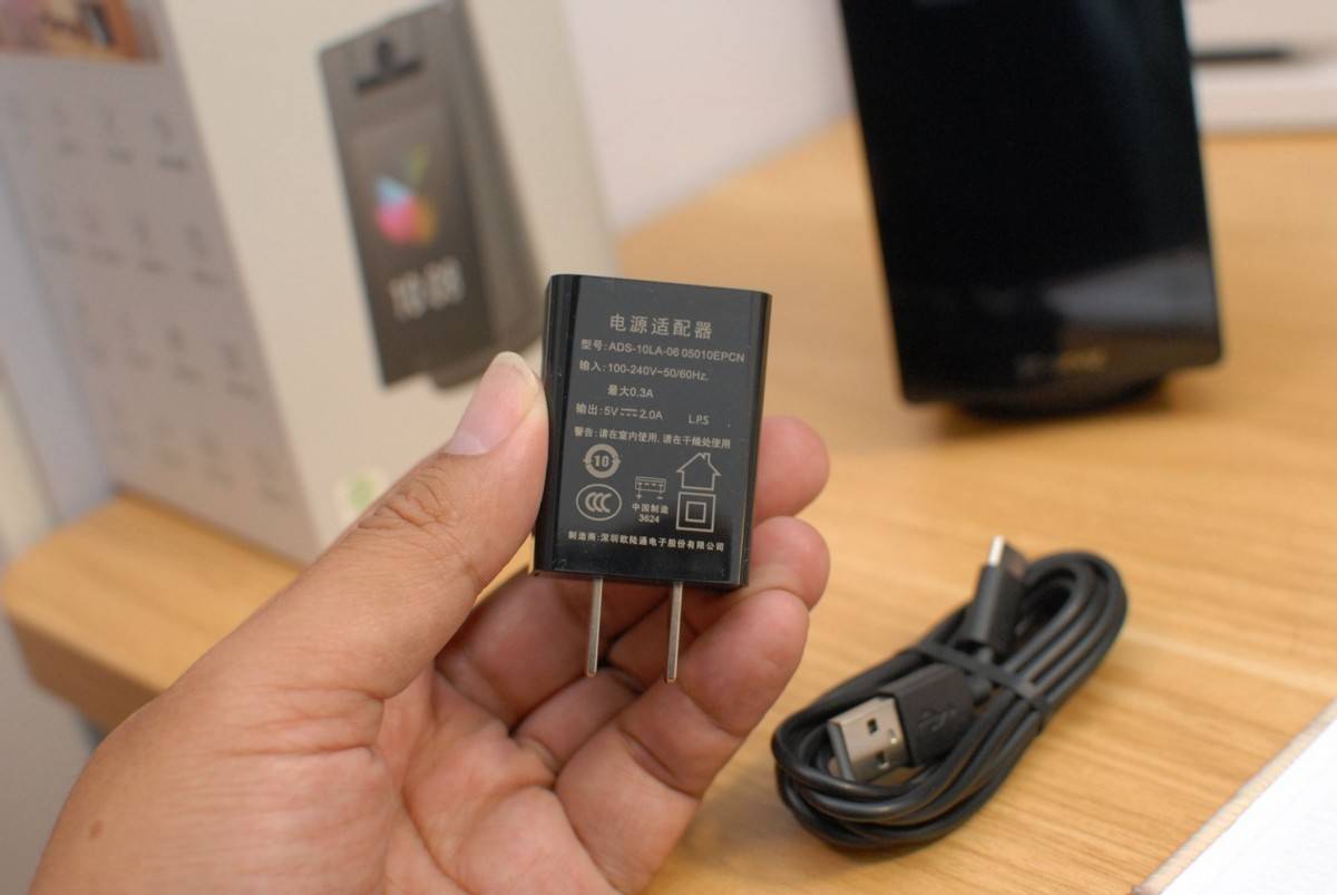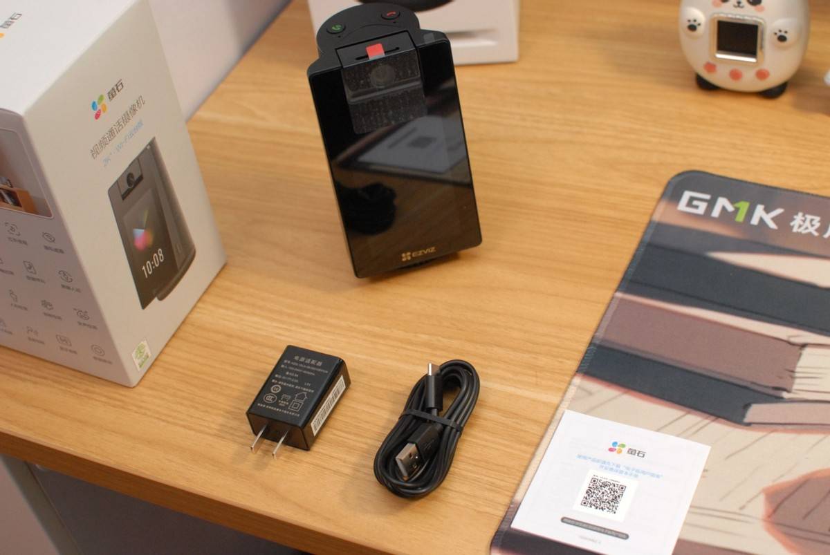 包装内的物件展示,除了视频通话机之外,还有电源适配器、Type-C接口电源线和说明书。