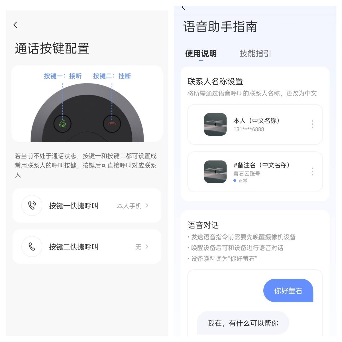 萤石S10视频通话摄像机的顶部设有拨出键和挂机键,这两个实体按键在APP里均可自定义功能。