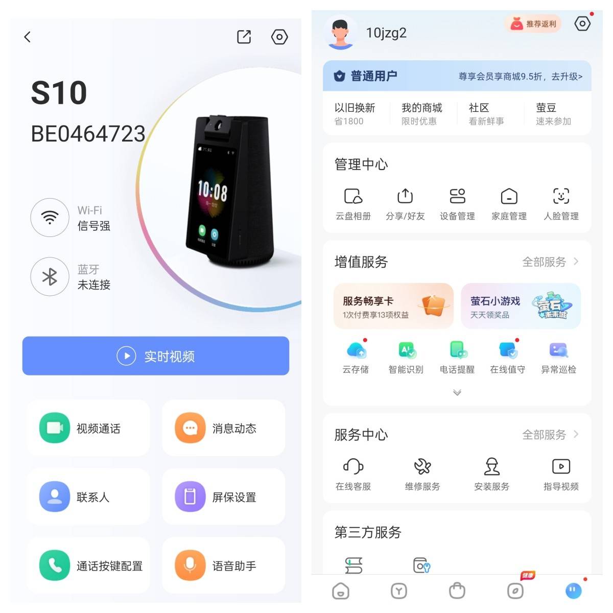 萤石S10视频通话摄像机APP的主页面提供了实时视频、连接蓝牙音箱、设置屏保等功能。如需更多功能,可以进入“我的”选项进行操作。