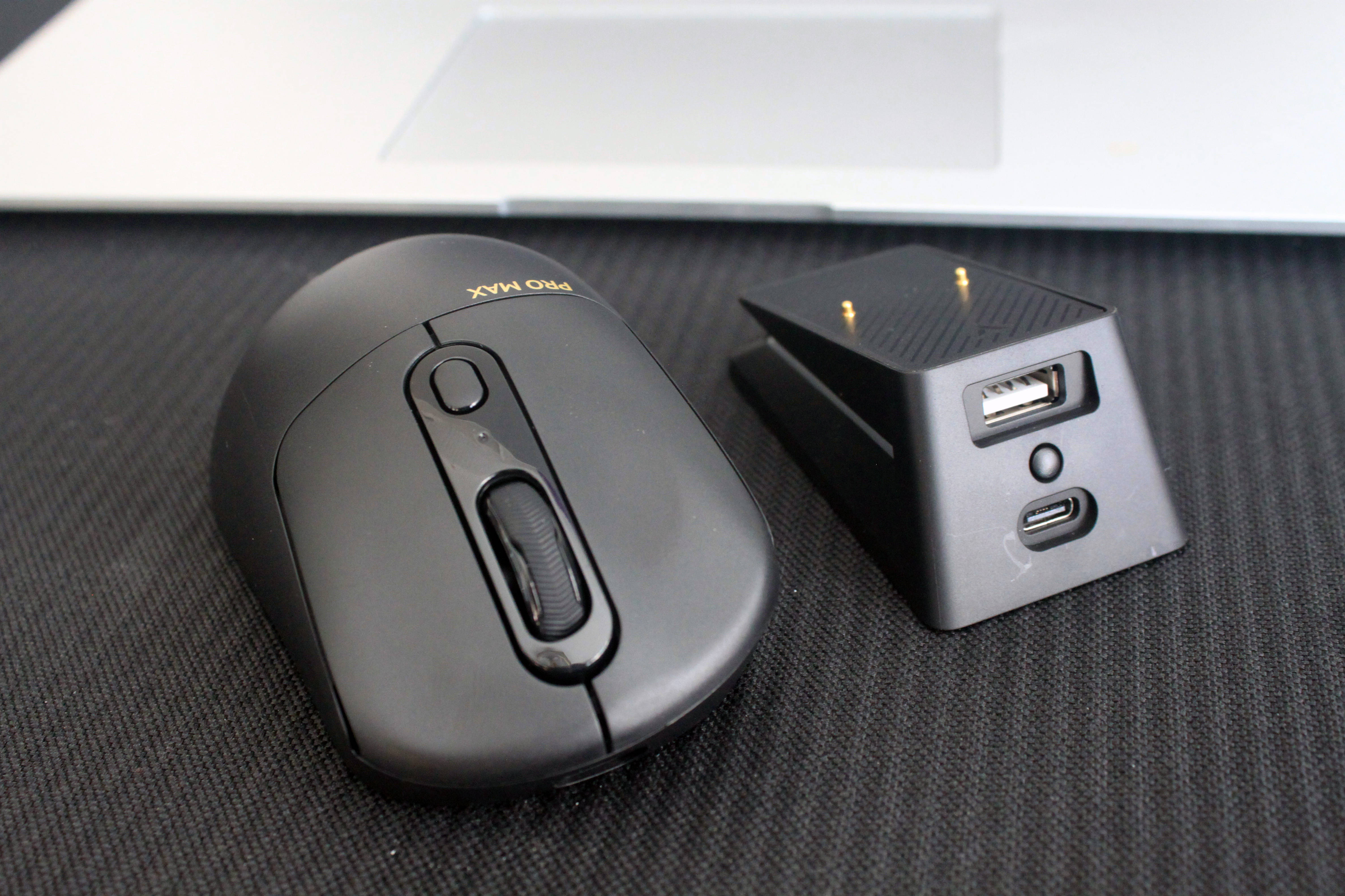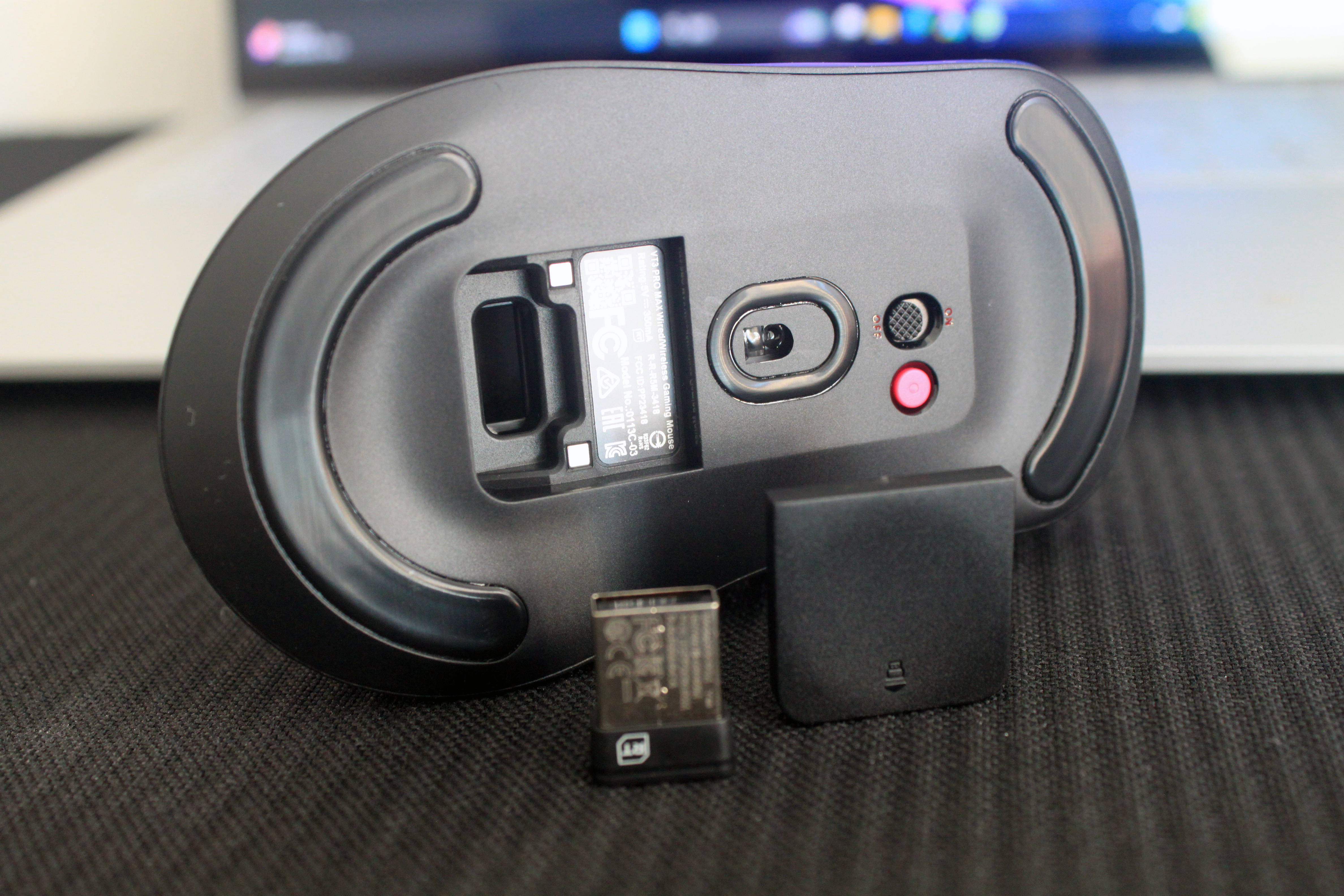 在鼠标的底部,还设计了一个充电模块的扩展仓,支持无线充电的扩展,同时它也是一个USB接收器的收纳仓,方便收纳和管理接收器。